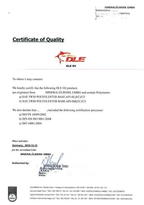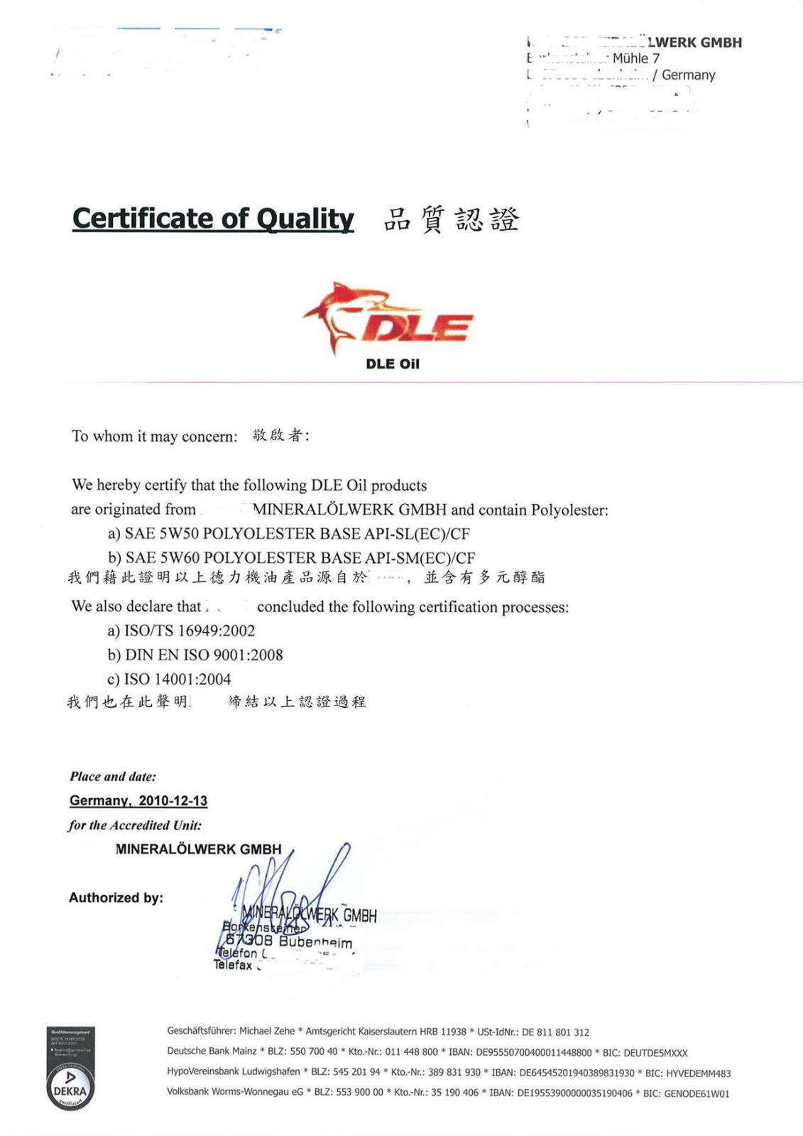 德力取得德國油廠實驗室品質保證書-確保機油內有-[高比率多元醇酯]成分..(我們做生意的誠信)