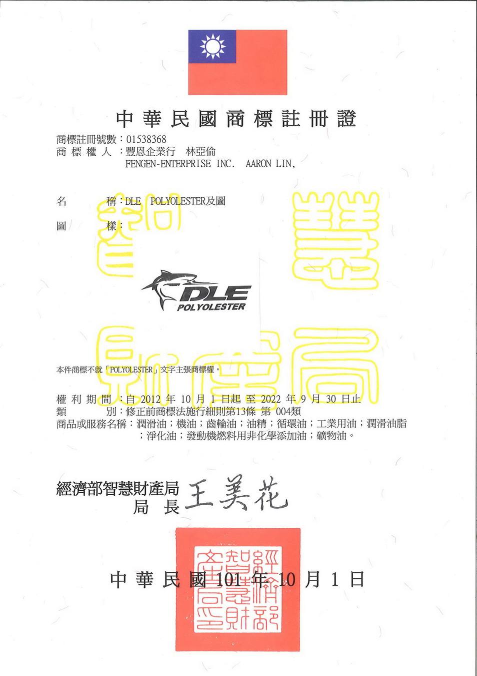 國內第一家遵照美國API石油協會制訂基礎油成份商標註冊DLE-POLYOLESTER商標註冊已經正式通過---(機油成份絕對不能造假)