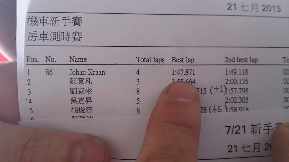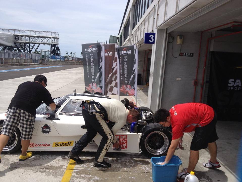 從上星期五一直練車與調整車輛至最好狀況,還是屬於調整與測試階段,全體工作人員合作無間由日亞負責車輛改裝與調教.星期六還跑出1分49秒多老外教練還不滿意.整輛車做最後整理,把該清潔的地方重新清理一次,電腦軟體在重新調教一次.昨天就跑出1分47秒多,跑出4缸引擎最快實力.老外教練很滿意,新手賽也拿第一,差距一圈距離.saker車實力不容忽視-----姚元浩星期五到大鵬灣練車,開saker車跑出1分54秒多他好開心,saker也要多一位新買主,星期六來練車開起來很滿意.入主saker下一位車主.