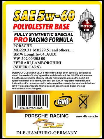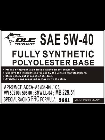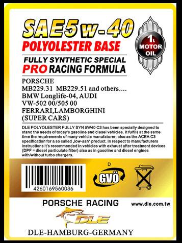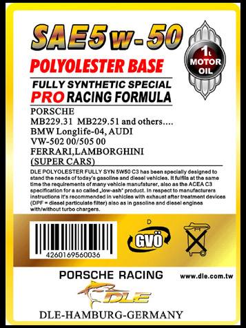 德國油廠答應機油可以品質又提升,已經下訂單給德國油廠.OEM好處可以要求油廠提供更好產品.DLE-就是這樣一直向德國油廠要求更好品質,多元醇酯技術門檻很高,油廠要提升產品技術也不是那麼容易.有德國紐柏林耐久賽賽車技術,一有好的添加劑我們一定優先使用.一般原廠規範機油用不到那麼先進添加劑技術.我們DLE獨享特有添加劑技術,相對購油成本提高.台灣店家與車友很有福氣用到世界最先進添加劑技術-----已經把商標貼紙圖檔寄去德國油廠審核.(紐柏林賽道比賽機油優先使用,再來就是我們DLE.)