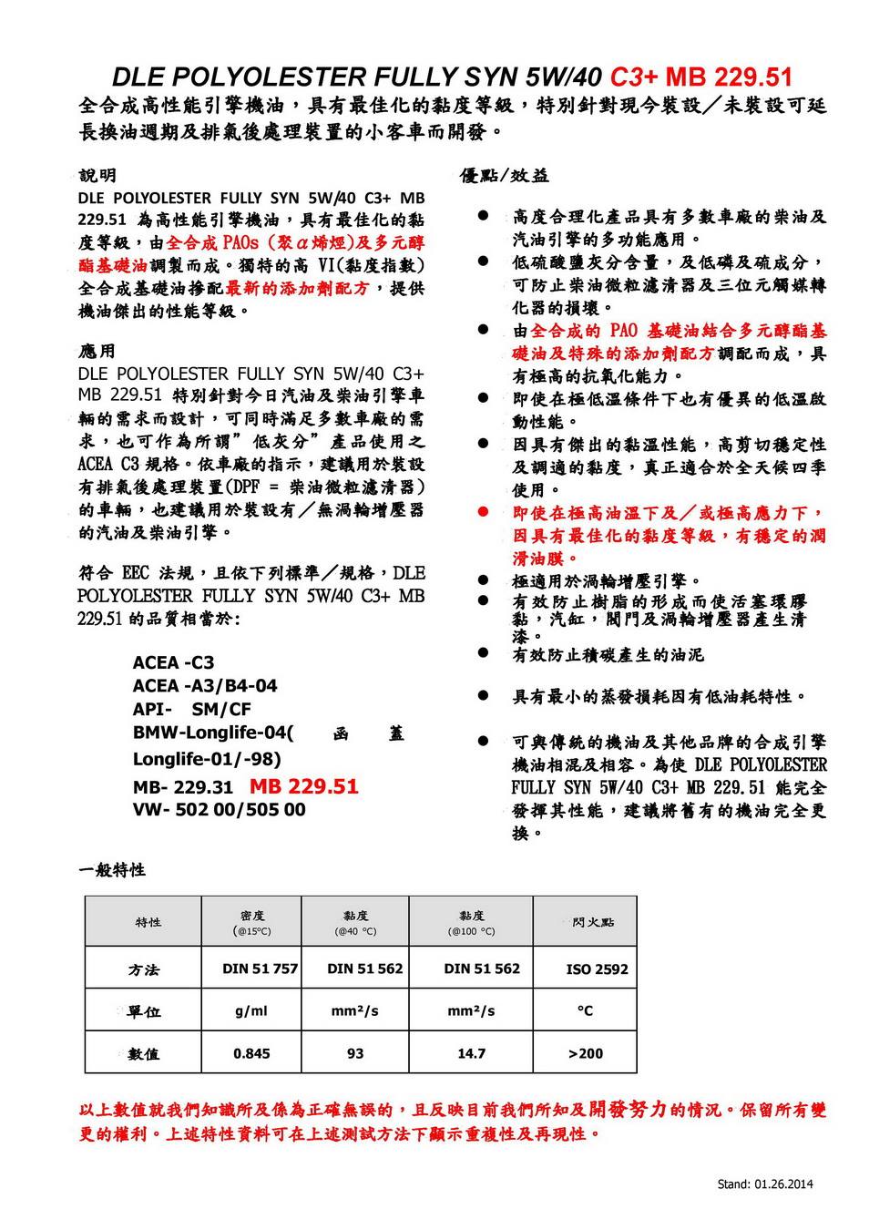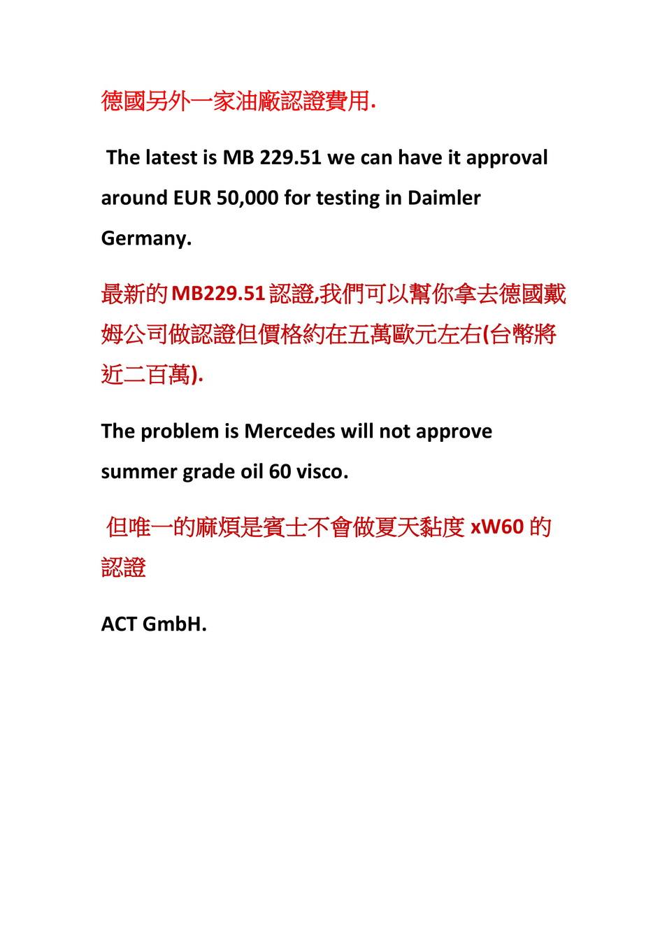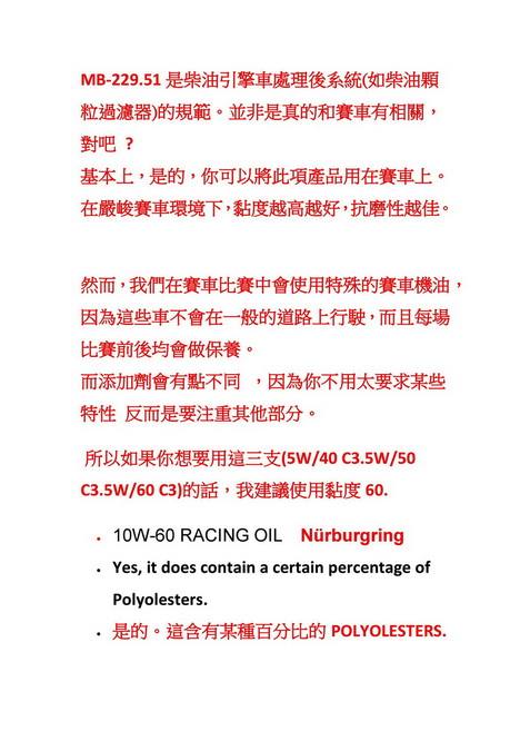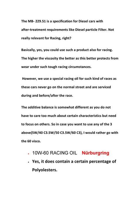 德國油廠突破多元醇酯技術瓶頸,終於研發出更潤滑與更耐高溫穩定性,C3+ MB-229.51機油. 來自Nürburgring 24小時耐久賽SLS AMG GT3車隊比賽研發高科技添加劑技術.
