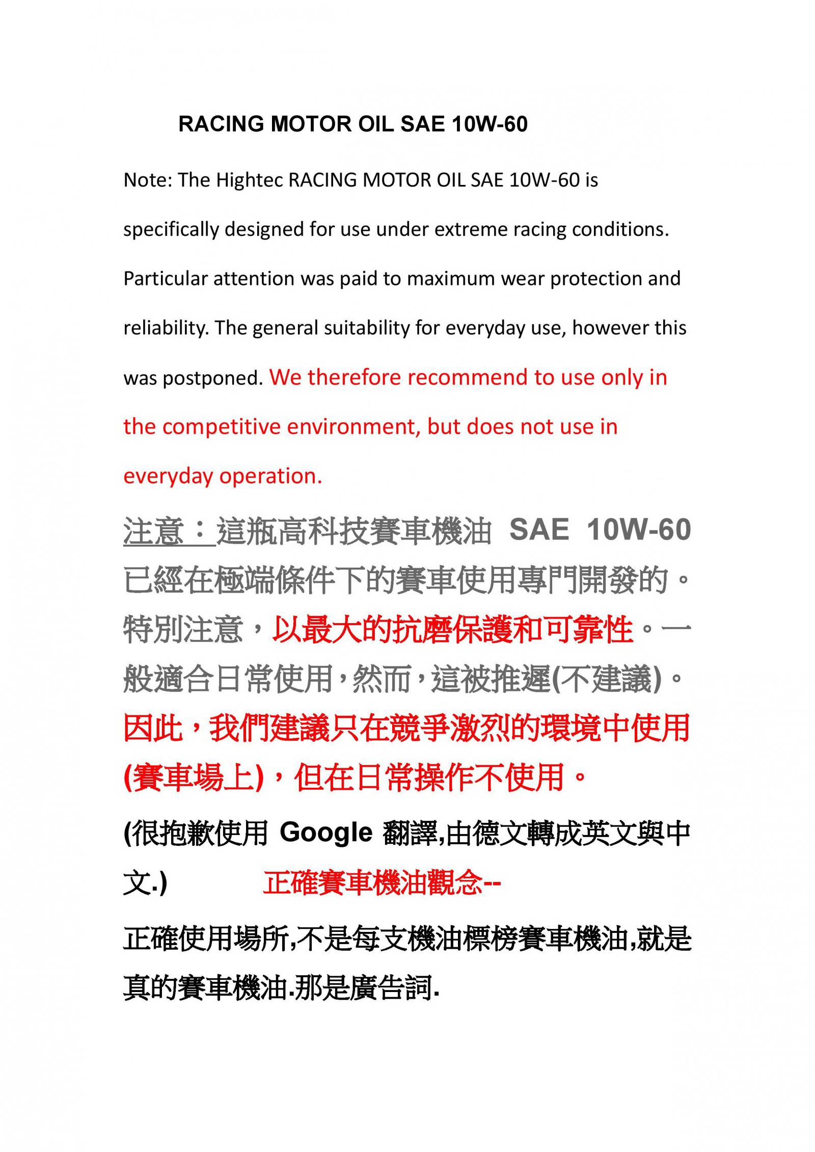The Hightec RACING MOTOR OIL--賽車機油迷失