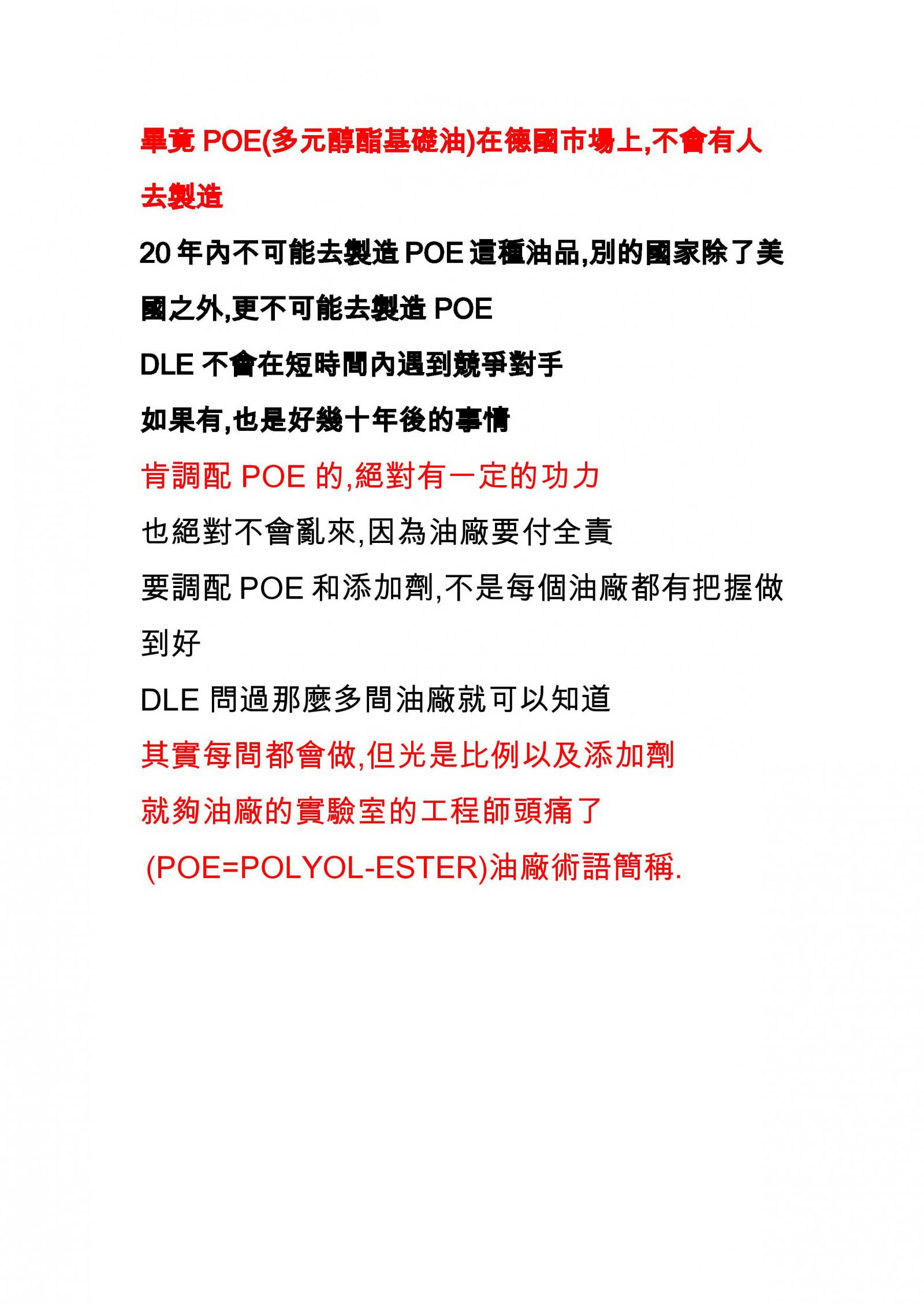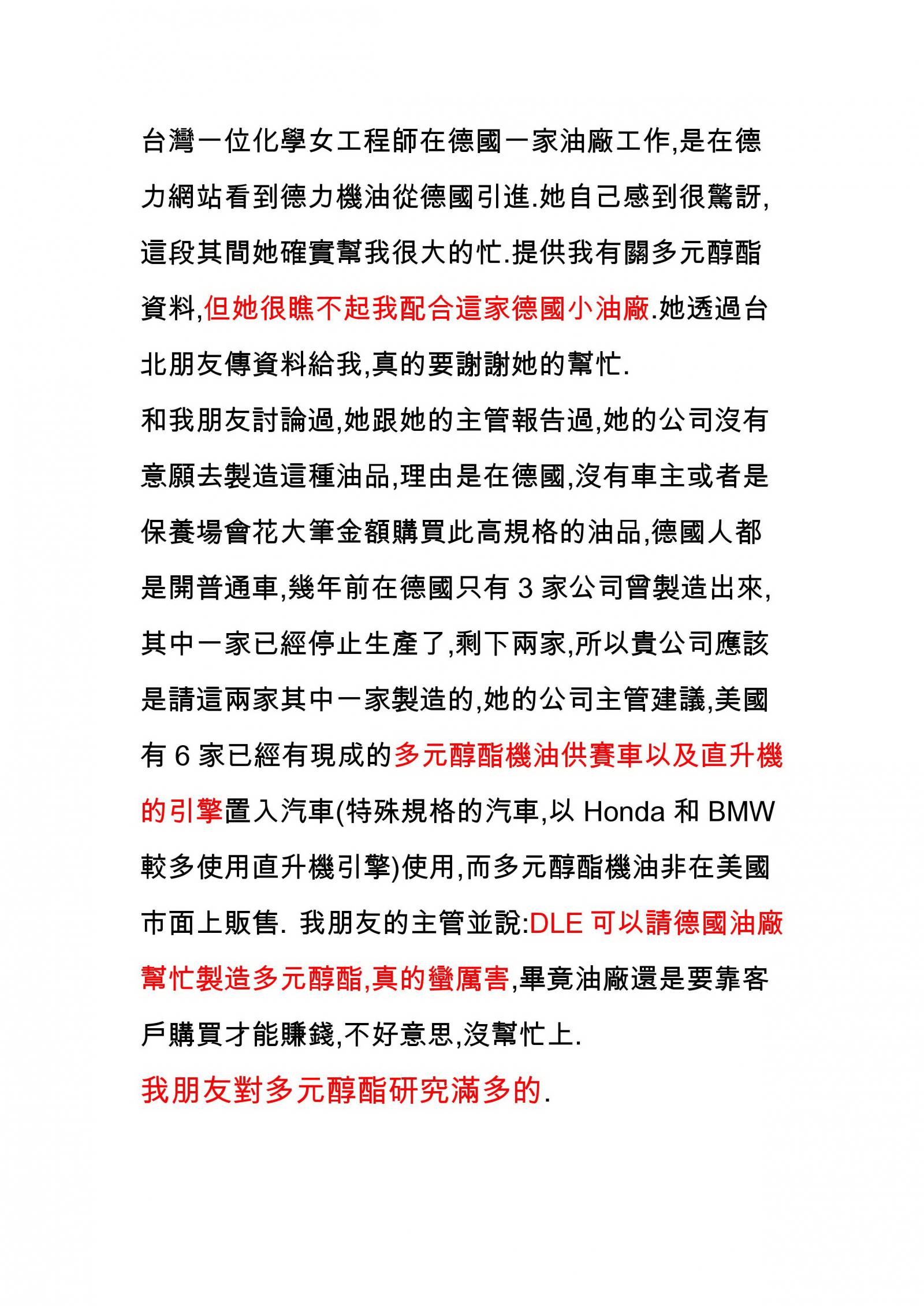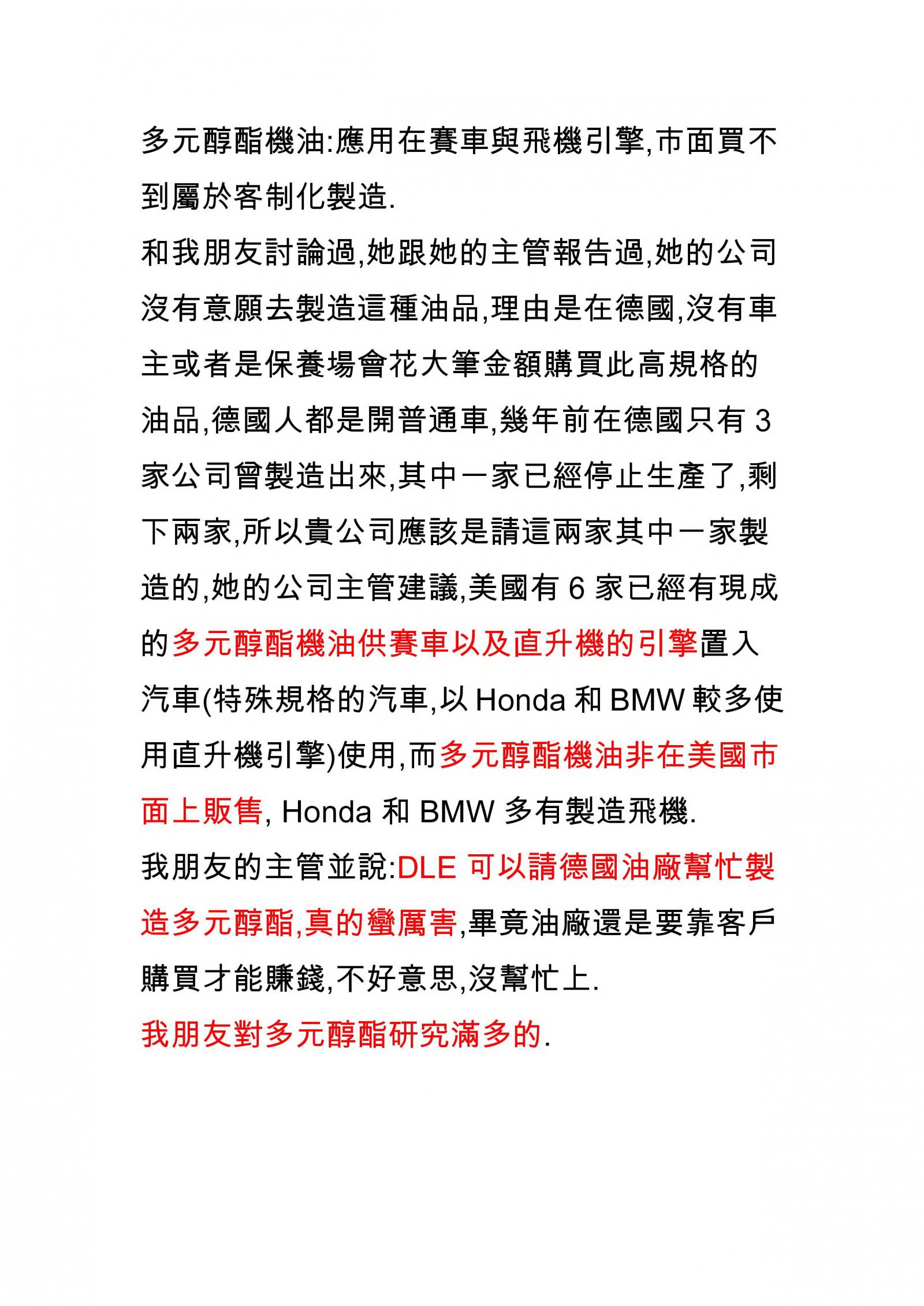 我朋友的主管並說:DLE可以請德國油廠幫忙製造多元醇酯,真的蠻厲害,畢竟油廠還是要靠客戶購買才能賺錢,不好意思,沒幫忙上.