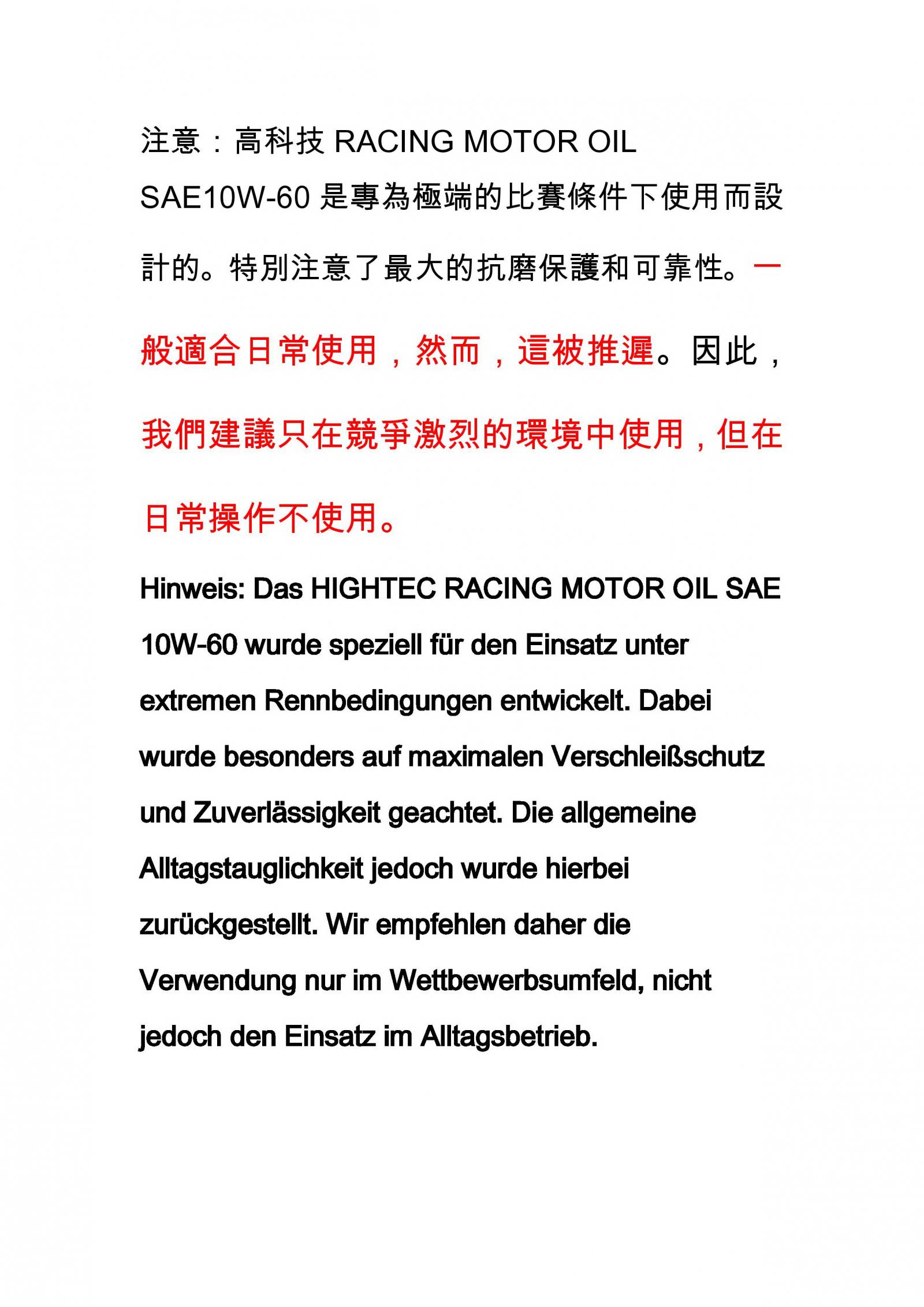 注意:本克斯摩托車類油SAE 10W-60已經在極端條件下的賽車使用專門開發的。特別注意,以最大的抗磨保護和可靠性。一般適合日常使用,然而,這被推遲。因此,我們建議只在競爭激烈的環境中使用,但在日常操作不使用。