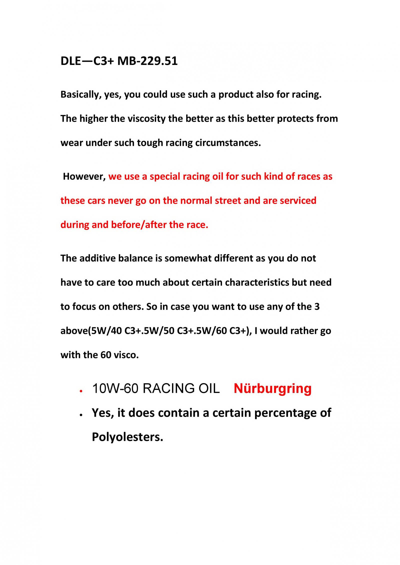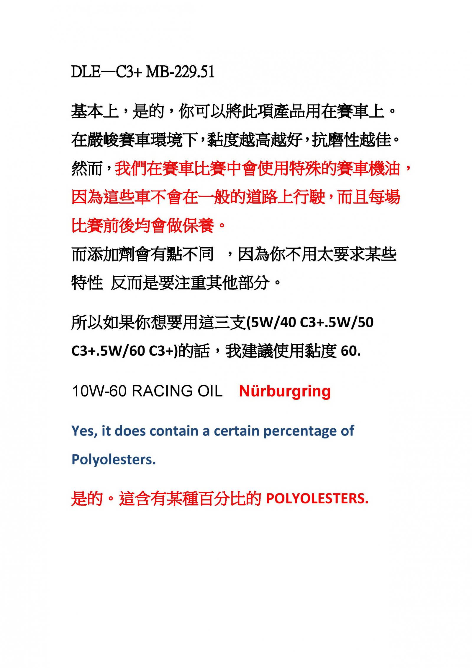 凡事我們都謹慎求證--確保用油觀念正確,不是廣告上的賽車機油都是真正賽車機油,可以買的到賽車機油就是真正用在賽車場上.德國有專門研發賽車機油的油廠(是用多元醇酯基礎油),只提供賽車用市面上是買不到---以下是德國油廠回信-----