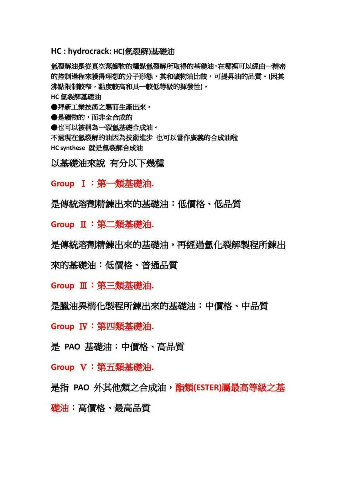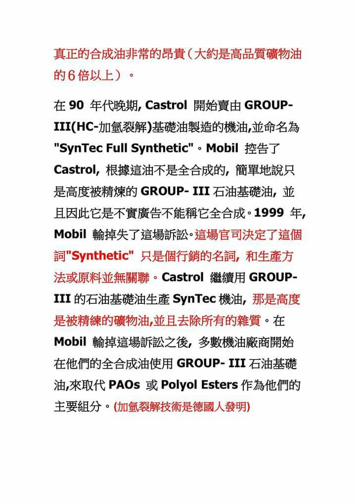 市售機油分兩大主流:1-原油提煉HC基礎油API-III(美孚告嘉實多機油最後美孚敗訴,便宜全合成機油從此大量生產.)2-液化天然氣提煉SHELL專利HC基楚油.幾乎全世界車廠機油都使用這兩種基礎油,車廠不會告知你機油成份叫你使用它們原廠機油有保固時候到是換車還是修理.