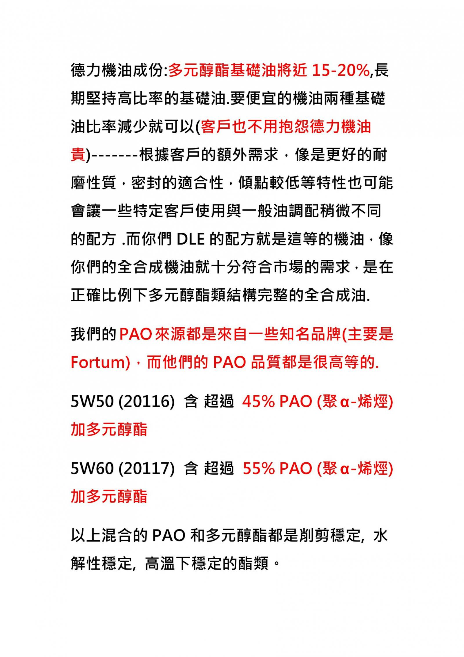 多元醇酯機油--獨特性是所有市售一般機油無可取代,POLYOL-ESTER BASE研發確實是技術門檻很高.要有研發此POLYOL-ESTER BASE設備儀器成本很高.有這些設備儀器與技術不一定就能研發出好用多元醇酯機油,DLE從2007購買樣品開始至2016年才有真正高品質MB-229.52多元醇酯超級賽車機油.(中間等待沒有一家油廠與進口商願意花費那麼長時間與金錢,從長期在賽道比賽纍積出來高科技研發摻配技術.)全世界只有一家德國不起眼小油廠做到現在是世界知名油廠,德國人堅毅不拔研發精神與台灣人耐心龜毛要求最好品質—台灣是多元醇酯機油測試場地(純賽車機油一般街車不能使用)