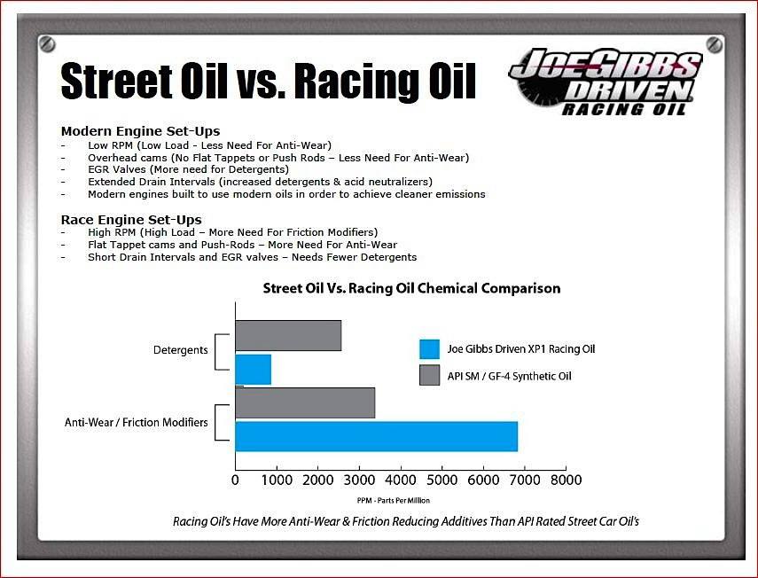 真正的賽車油含有不符合美國石油協會(API)標準的抗磨損和減摩助劑。額外的抗磨添加劑和額外的摩擦減少添加劑與甚至最佳的合成API許可油相比,提供了卓越的閥門部件保護和性能提升。耐磨添加劑(鋅)和摩擦減少劑(Moly)與優異的合成基礎油以及其他專利添加劑一起產生了一種配方,