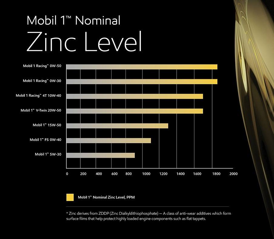 符合最新行業標準的汽車街道用油要比幾年前製定的油具有較低的鋅和磷抗磨性能。最新的汽車街道用機油設計為與排放控制設備兼容。美孚1賽車油配以防磨損(鋅/磷zinc and phosphorus)化學品,是汽車路面油兩倍的化學物質,可提供對某些賽車引擎中發現的高負荷閥門系統的更好保護。基於高水平的抗磨化學品,Mobil 1 Racing油不推薦用於街道使用