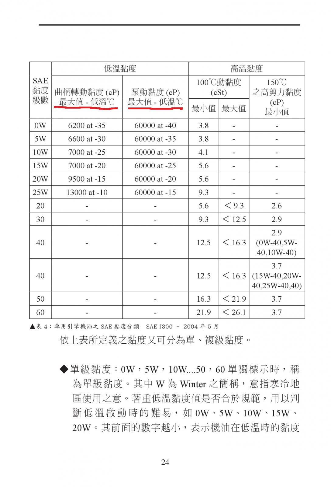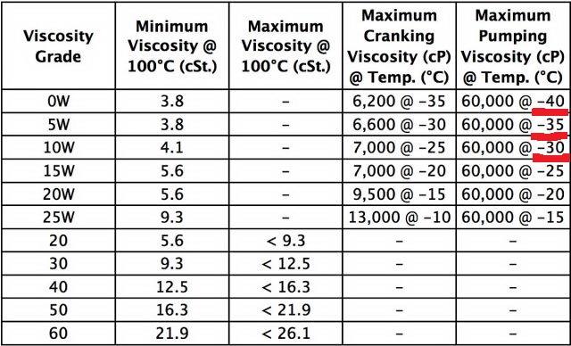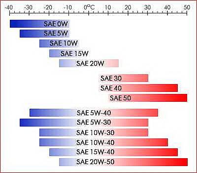 美國汽車工程師協會所(SAE)規範之黏度標示,其黏度標示的「W」代表「低溫黏度」值,判斷引擎低溫啟動時的難易: 如 0W、5W、10W、15W、20W....數字越小,表示低溫流動性越佳,不易結凍,較容易冷車啟動,因引擎冷車啟動時,零件磨耗較大,尤其是寒帶下雪的地區,必須使用較低的低溫黏度,如0W、5W,