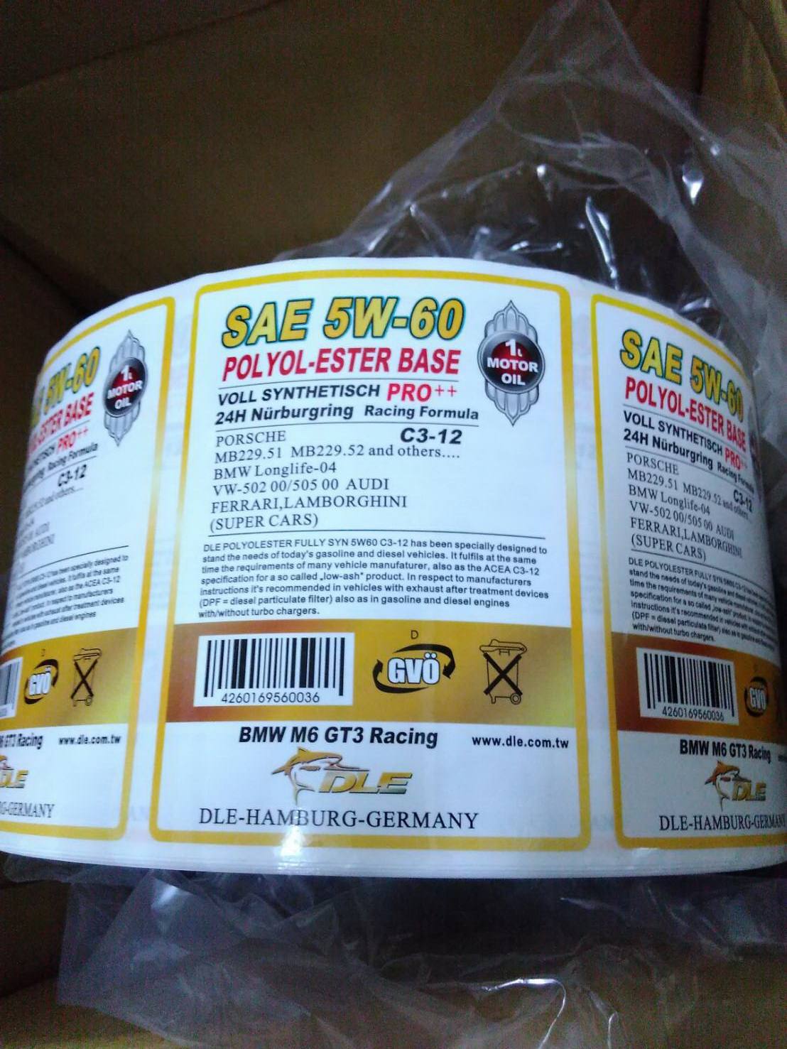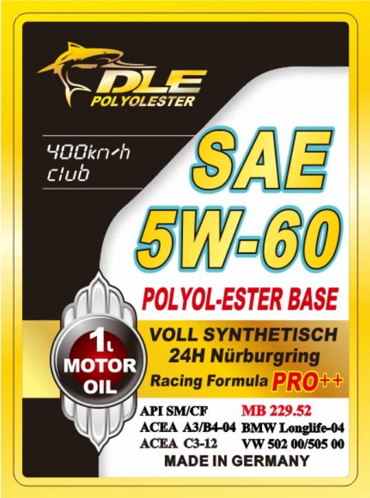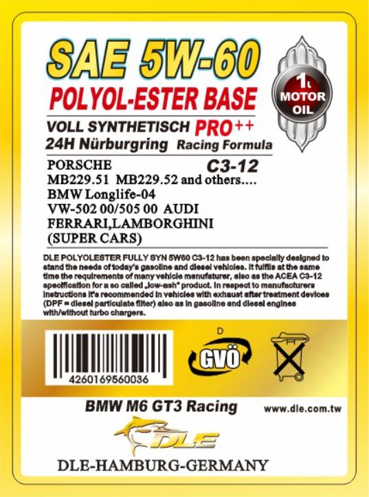 經歷11年努力溝通與德國油廠協調終於讓我們產品貼標正反面可以打上和賽車有關的資料,一般機油是跟賽車沒有關係也不能用於賽車,只限於一般街車.從頭到尾就是我們的產品請德國油廠研發就是請油廠研發多元醇酯基礎油用於賽車,沒有用於賽車多元醇酯機油比一般機油落差不會很大.靠長期比賽不斷研發和一般機油的落差確實很大,這是我們DLE機油所要的高品質產品.(全世界第一支多元醇酯機油經過24H Nürburgring賽道長期比賽測試認證,無與倫比的多元醇酯技術確保了最佳的剪切穩定性,並對最長達24小時的超長比賽提供發動機保護,專為極端賽車條件下的應用而開發。其中極為重視最大的磨損保護和可靠性。10W/60賽車專用機油)經歷BENZ SLS AMG GT3與BMW M6 GT3兩種GT3賽車長期賽道比賽.