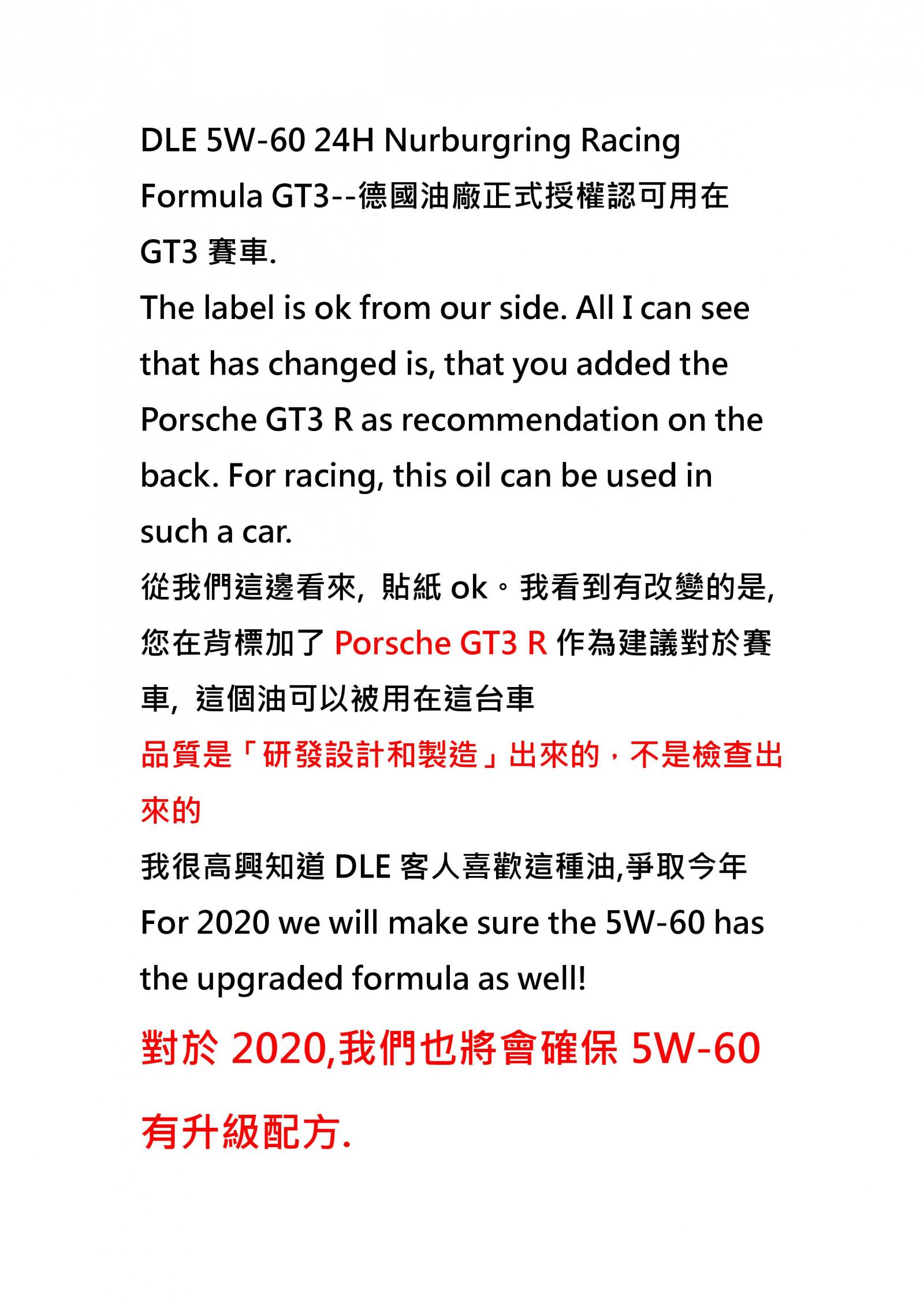 DLE 5W-60 GT3機油貼標從新修改,上星期送德國油廠審核.13日回信貼標審核通過,今年新訂單.