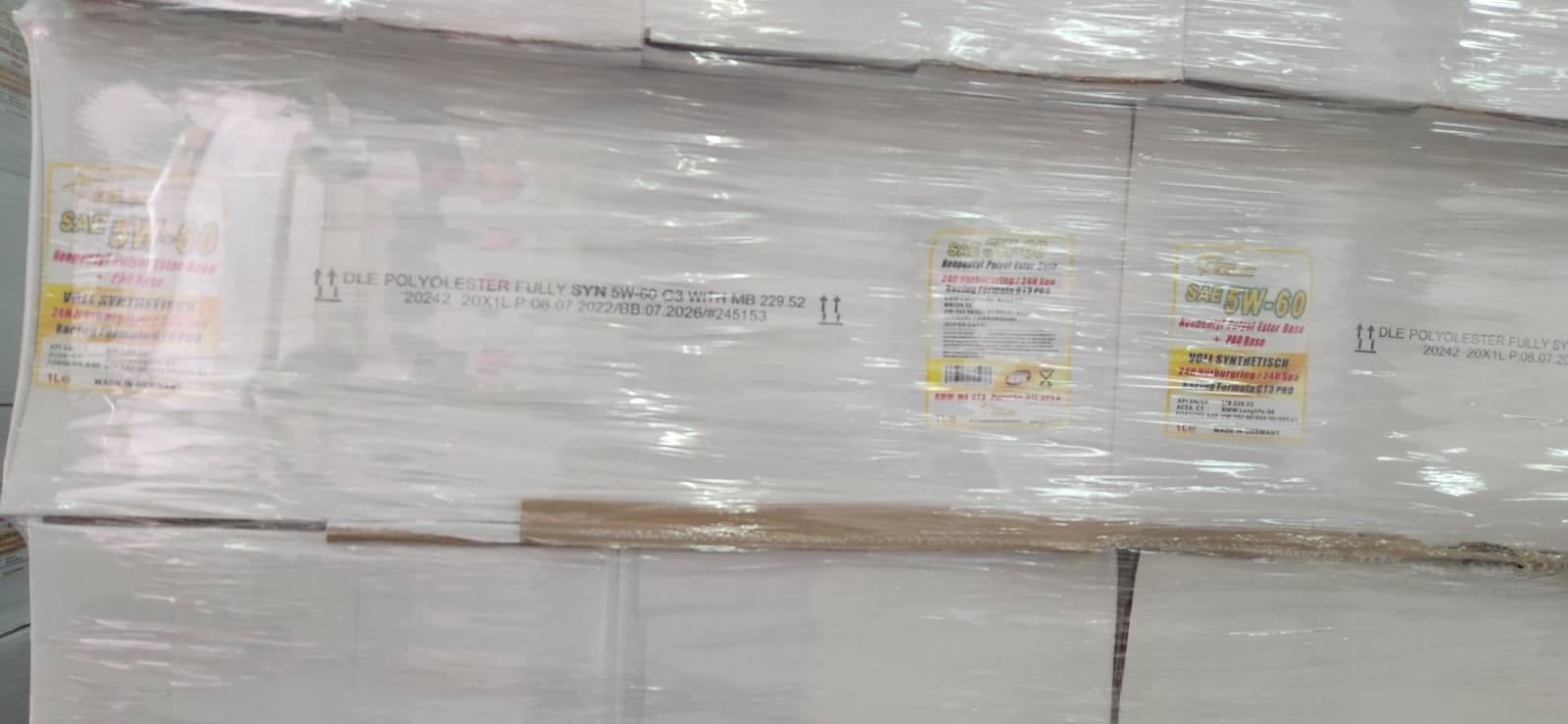 下午順利拆貨櫃,剛好下大雨,感謝主,順利完成。看到5W-60 24H GT3 PRO機油外箱貼標是新的,放心.