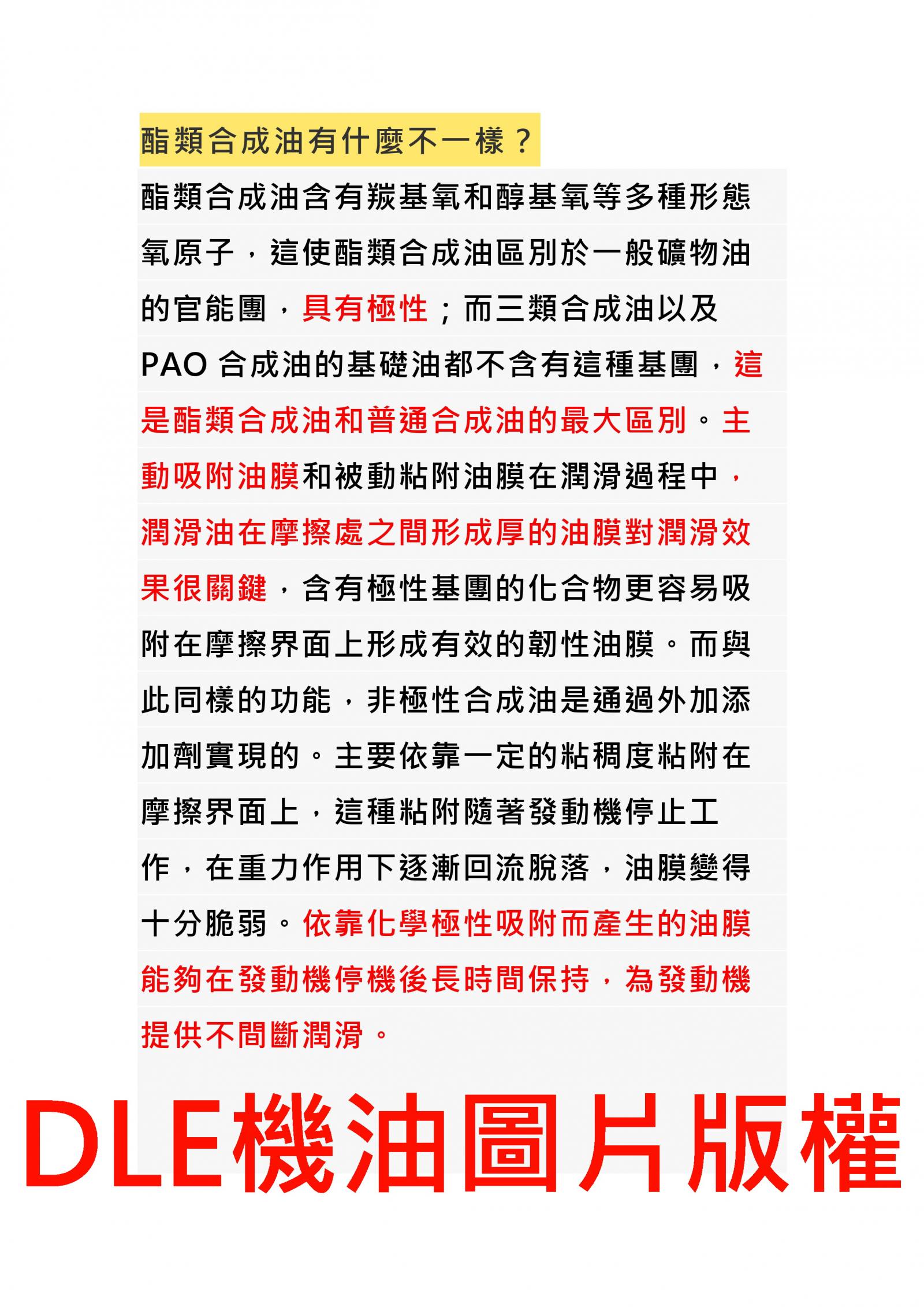 DLE新多元醇酯賽車機油,基礎油選用全世界航空與航天使用的基礎油,世界公認最好的基礎油.