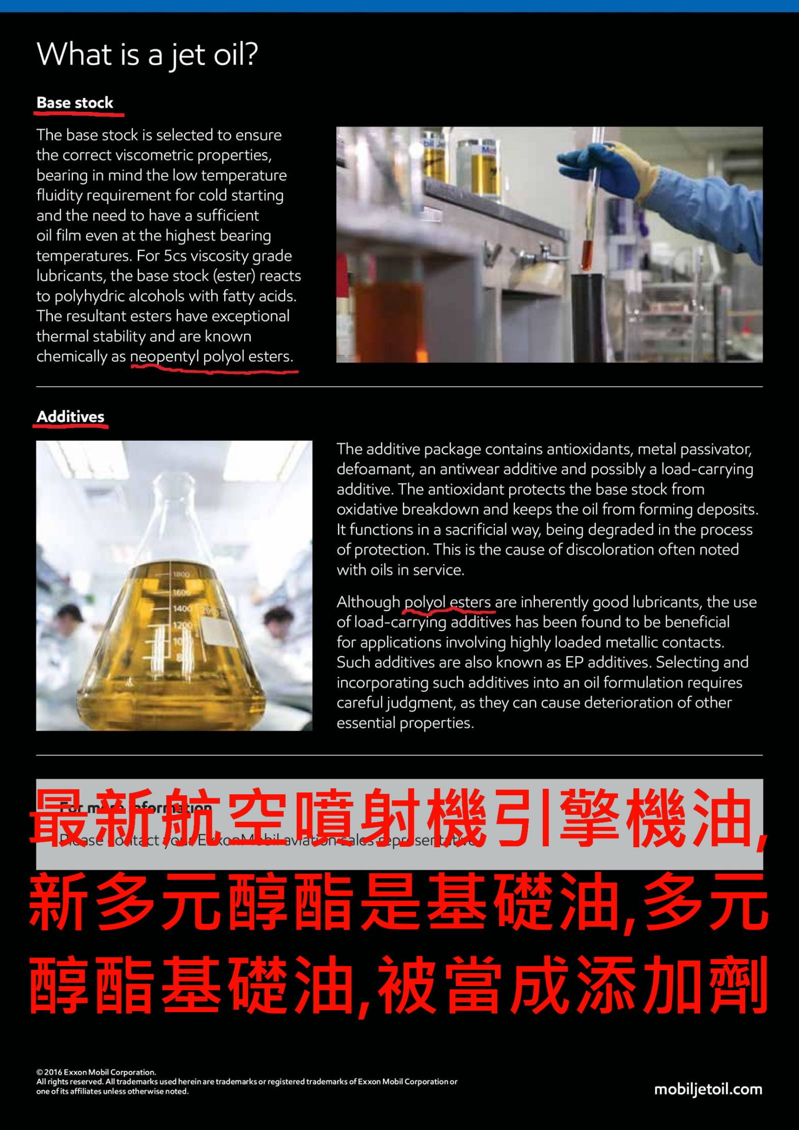 由美孚機油提供最新,新戊基多元醇酯(Neopentyl Polyol Ester)基礎油,來自目前最新航空渦輪發動引擎使用機油,在它們PDF檔找到下載.