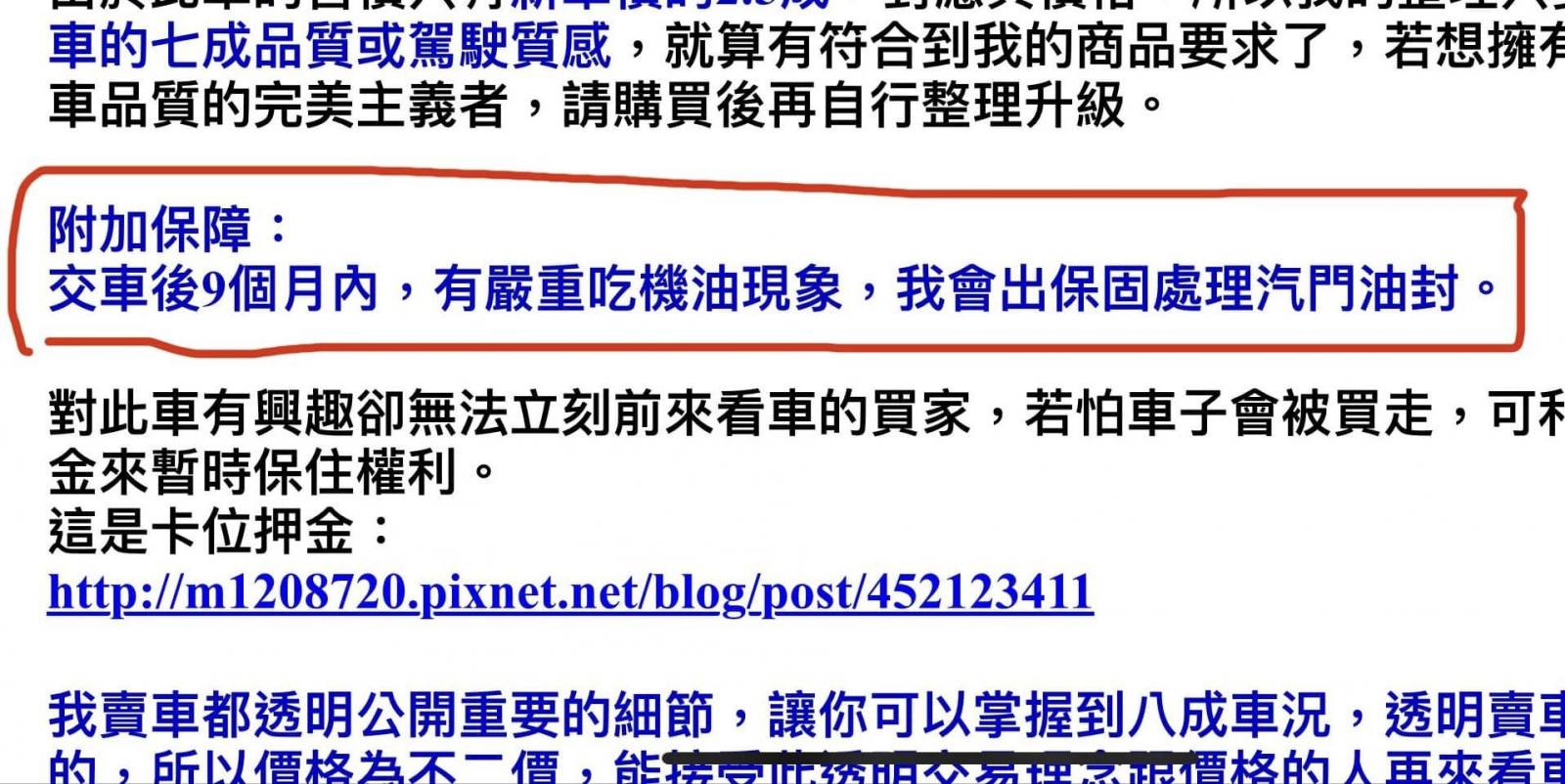 為了不確定是否有嚴重吃機油的現象,也為了保障跟我買車的客人權益,所以對這台BMW嚴重吃機油的保固,我由購買後三個月延長到九個月,並在合約書中寫上:交車後9個月內,有嚴重吃機油現象,我會出保固處理汽門油封。