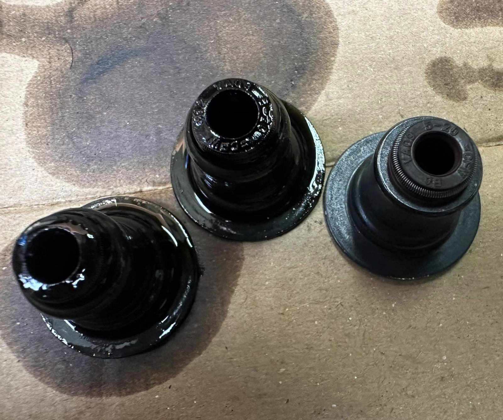 照片中就是這台BMW更換下來的新舊汽門油封對比照,很明顯的舊的汽門油封已經完全硬化失去彈性,而且孔徑也比新的汽門油封大了約¼。