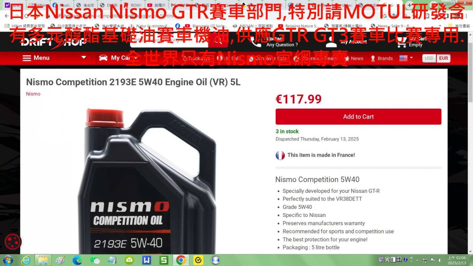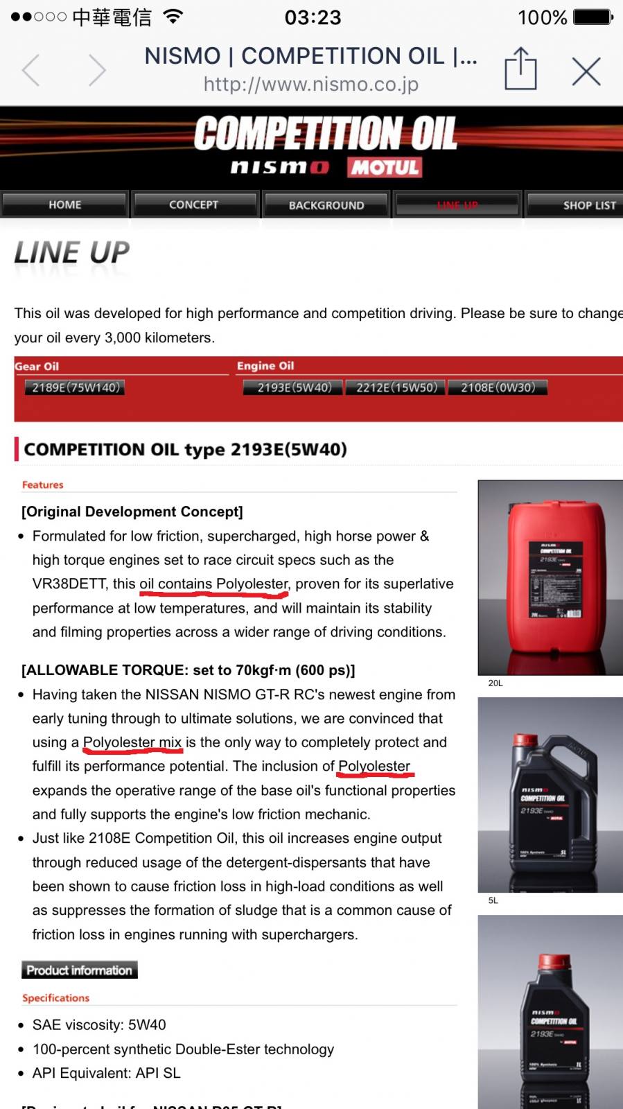 Competition oil type 2193E (5W40)此款油品是NISSAN NISMO和Motul合作開發專為賽車使用的機油。(競賽機油-含有多元醇酯基礎油)