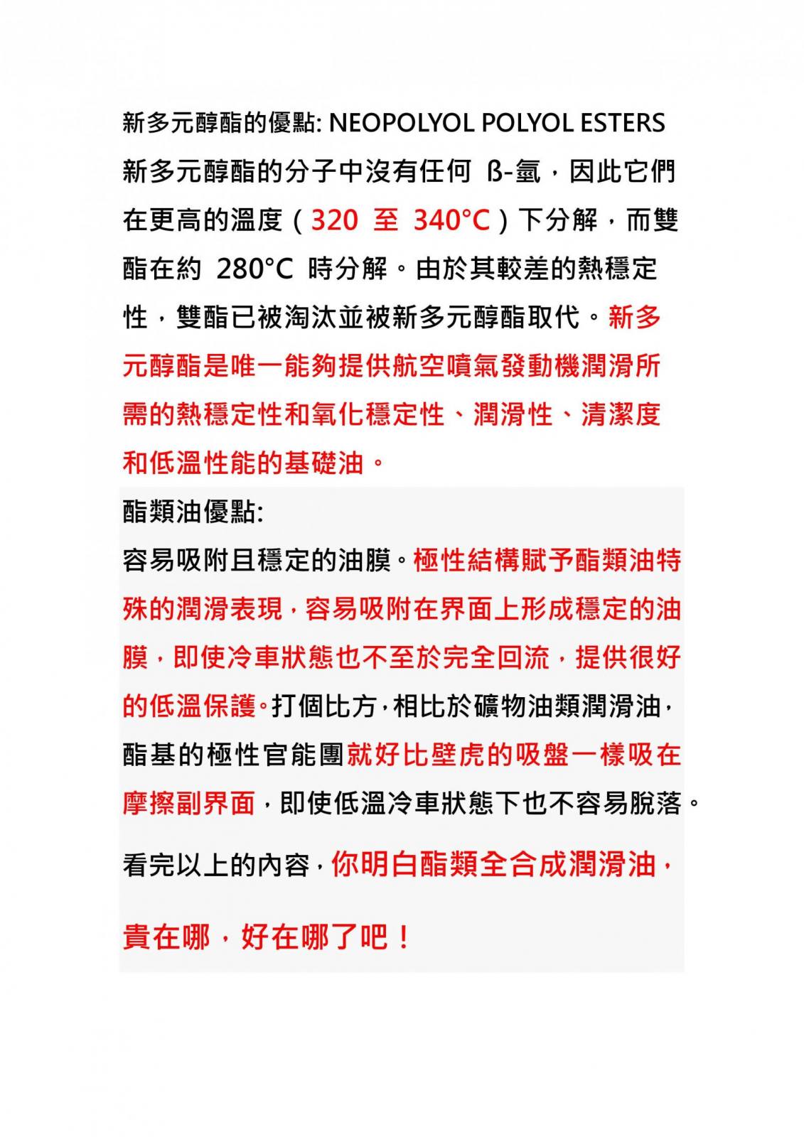 關於機油潤滑性和流速哪個重要? 機油的潤滑性和流速都非常重要,但它們在引擎運作中扮演著不同的角色。 潤滑性是機油最核心的功能,能降低零件之間的摩擦,保護引擎不受損。 流速則與潤滑性密切相關,它決定了機油在引擎內部能夠有效地到達各個需要潤滑的部位,並有效地降低摩擦。 至於哪個更重要? 潤滑性是機油最重要的功能,是引擎運轉的基礎。 如果機油沒有良好的潤滑性,即使流速良好,也無法保護引擎零件不受損壞。 但是,潤滑性與流速是相輔相成的,良好的流速能確保機油能夠有效地達到引擎的各個部位,並發揮潤滑的作用。 機油的潤滑性和流速對引擎的正常運作至關重要,它們共同影響引擎的壽命、效率和性能。 潤滑性能好壞在於能否有效降低金屬零件間的摩擦和磨損,而流速則確保機油能快速且充分地潤滑引擎的各個部分。 機油的潤滑性決定它在引擎內部的零件之間能形成一層保護油膜,降低引擎內零件的摩擦、磨損,並延長引擎壽命。 保持零件的清潔,防止積碳和油泥的形成。 機油的流速則與黏度有關,黏度低的機油流速快,在需要低溫啟動的寒帶地區使用。 而黏度高的機油流速較慢些,能提供更好的高溫保護,適合氣候炎熱地區使用。 儘管流速對於引擎的發動和運轉有所影響,但潤滑性對於引擎壽命和性能影響更重要。 因此,應優先選擇潤滑性能好的機油,並且根據所處地區選擇適合地區氣候的黏度。 確保機油在各種溫度下都能保持良好的潤滑性能。 賓士F-1賽車隊-引擎設計工程師,和馬來西亞石油公司(Petronas)歐洲賽車機油研發工程師。 聯合講解F-1賽車機油在賽車引擎內部,兩個最重要的作用:1-潤滑 2-油膜(防止金屬與金屬接觸)。 DLE的5W-60與5W-50機油比照F-1賽車機油,高規格保護引擎壽命,請德國油廠實驗室研發工程師,研發最新航空新戊基多元醇酯基礎油。 選擇真正全合成機油比一般全合成機油,對引擎內部零件保護絕對比低黏度機油比較好。 這20年日本車廠積極推機油流速0W極稀黏度,後面歐美車廠也跟進。 忽略機油潤滑性對引擎內部零件保護與延長壽命重要性,原車廠洗腦式灌輸車主原廠低黏度機油流速比潤滑性重要。 0W機油強調冷車啟動流速,忽略機油後面黏度,潤滑性夠(增強引擎動力)與油膜(防止引擎內部零件磨損)。 近年來車主回原車廠保養時都會叫他們使用原廠機油,說使用原廠機油保養會保護引擎零件。 實際上原廠的機油都使用較為便宜的礦物油作為基礎油來給客戶的車子進行保養,已獲取較高的利潤。 車子難開又沒有什麼保護效果,機油也不耐高溫。 有原廠認證的標籤只能代表說這是符合這個車型使用,並不一定就是最好的。 車主在選購機油時應選擇品質好的全合成的機油,不要被原廠機油才是好的觀念給綁死。 全合成機油在價格上比起使用礦物油作為基礎油的機油較昂貴。 但在保護性能上優於礦物油。 某些原廠所使用0W-20這類的稀薄機油並不適合台灣這種炎熱的天氣。 能選擇更好品質的機油來保護引擎。 例如選擇瓶子上標籤是否有VOLLSYNTHETISCHES等字樣。 只要是德國本土生產的機油,且瓶子上印有VOLLSYNTHETISCHES英文的潤滑油,肯定是真正的全合成機油,它只含有第四類PAO+第五類酯基礎油。 因為德國對於潤滑油的審查標準非常嚴格。 只有完全不含第三類基礎油的潤滑油,才能被稱為全合成潤滑油。 |