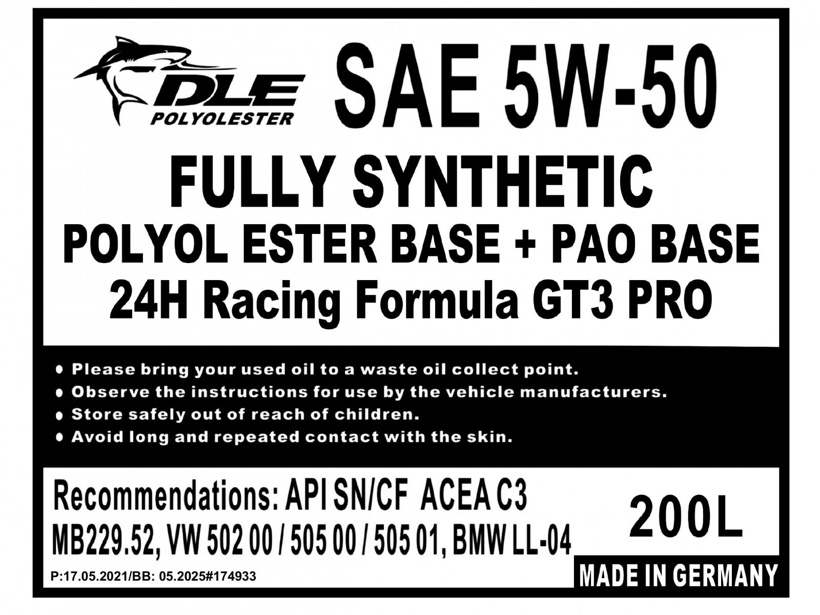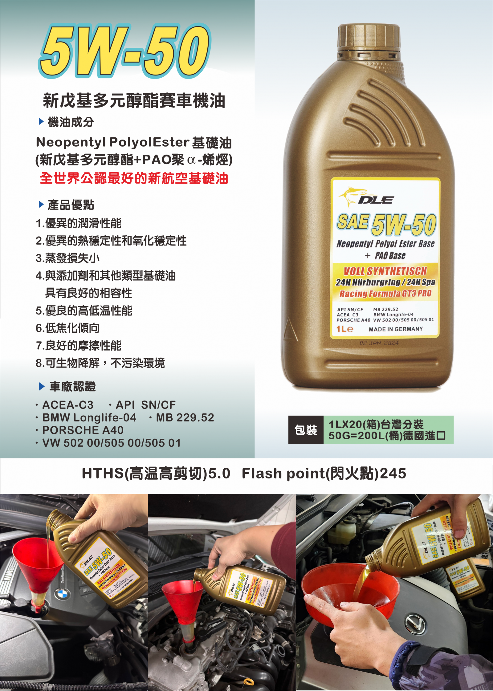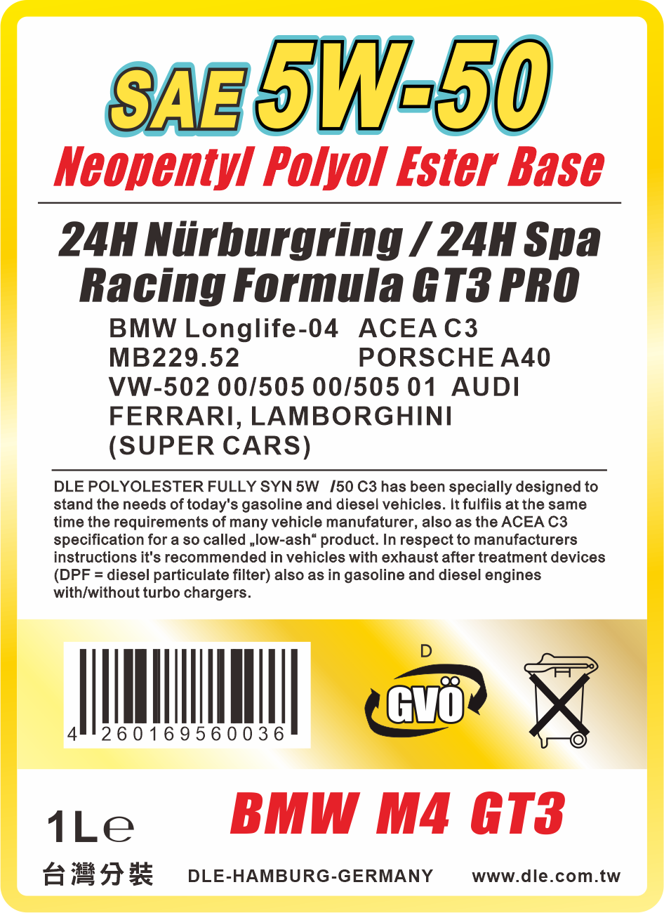 但為了達到DLE Polyol-Ester FULLY SYN 5W-50 24H GT3 PRO完整的性能效益,建議將舊有的機油完全更換。
