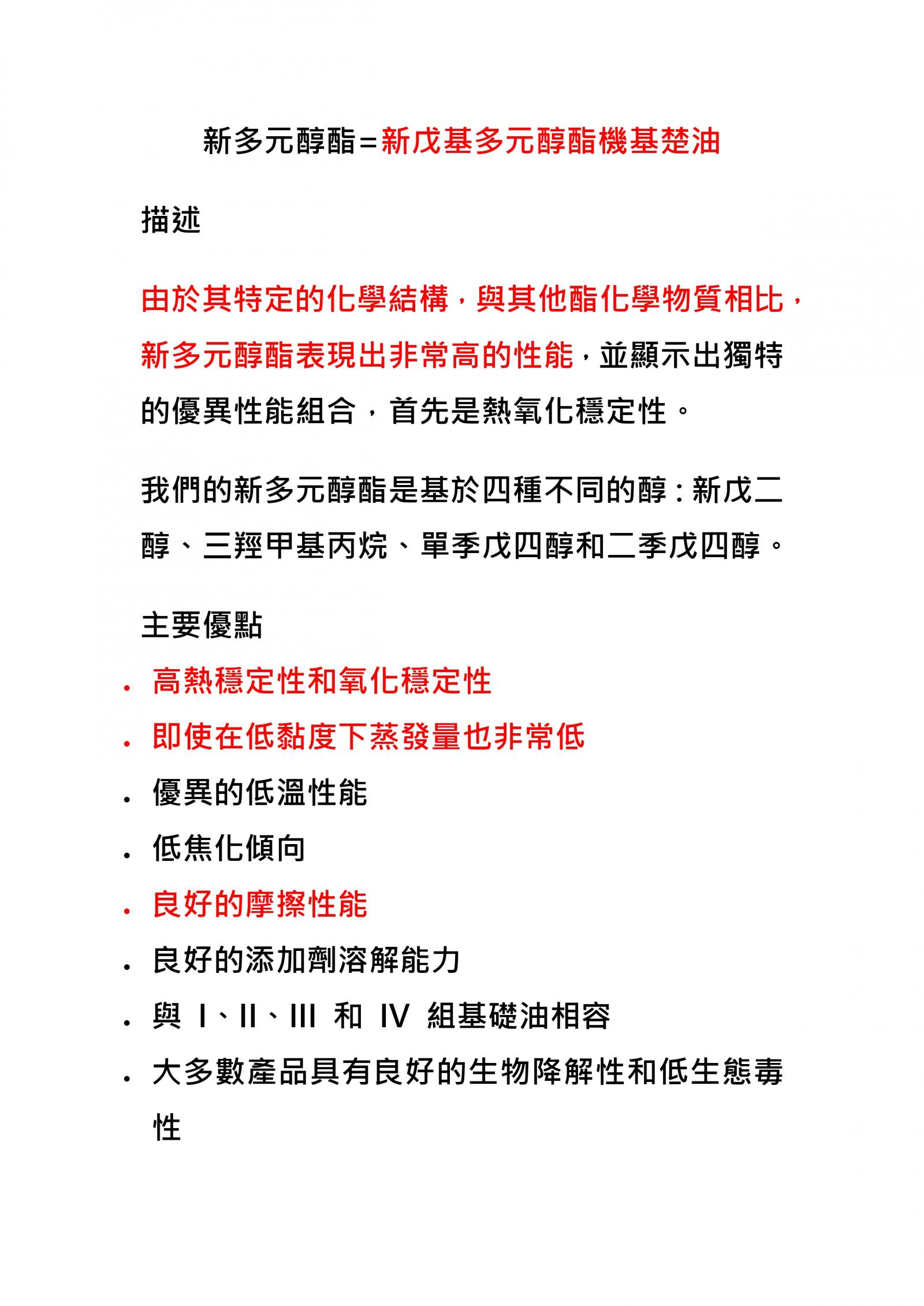 新戊基航空多元醇酯賽車機油NEOPOLYOL ESTERS 新多元醇酯的分子中沒有任何 ß-氫,因此它們在更高的溫度(320 至 340°C)下分解,而雙酯在約 280°C 時分解。由於其較差的熱穩定性,雙酯已被淘汰並被新多元醇酯取代。新多元醇酯是唯一能夠提供噴氣發動機潤滑所需的熱穩定性和氧化穩定性、潤滑性、清潔度和低溫性能的基礎油。