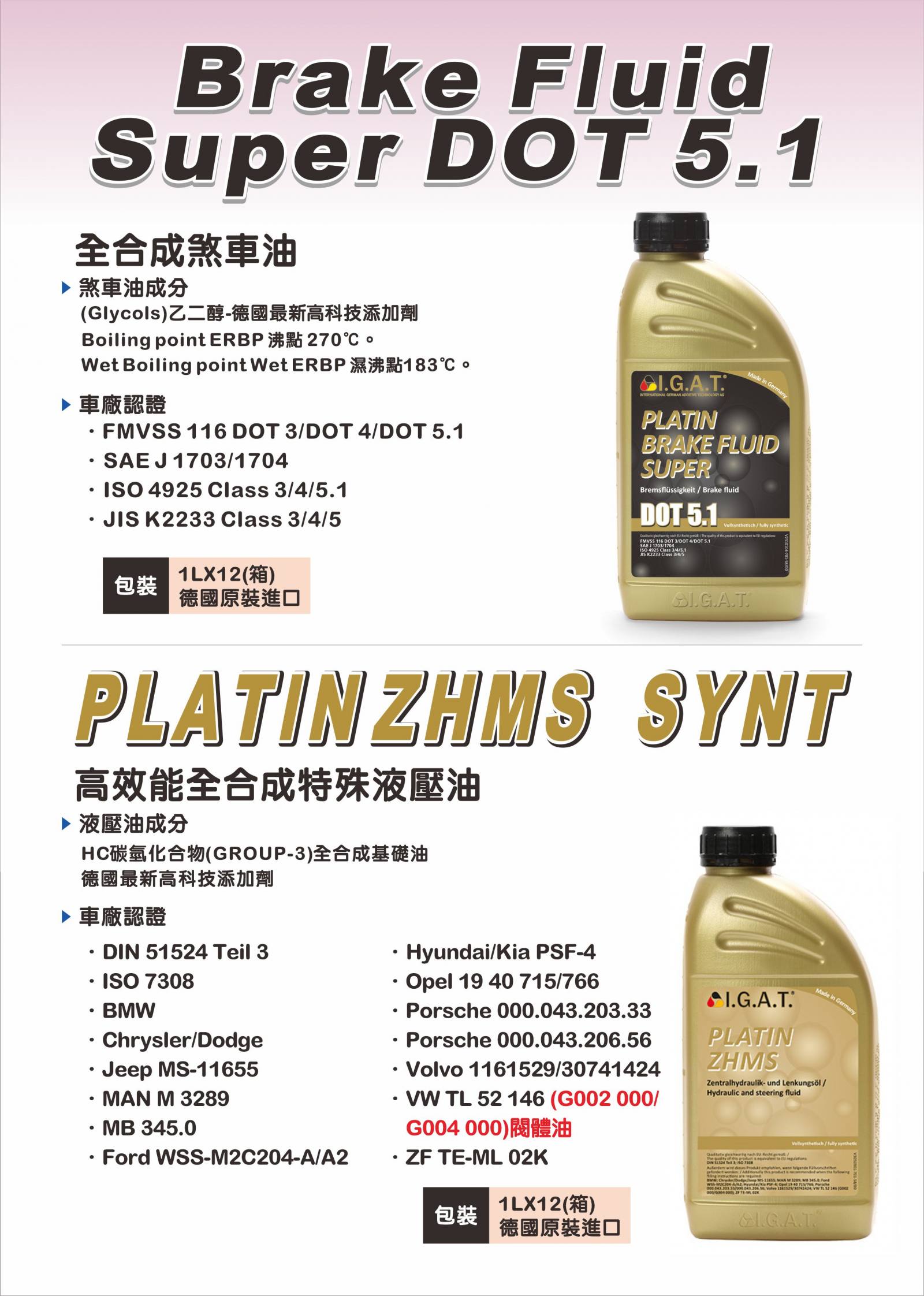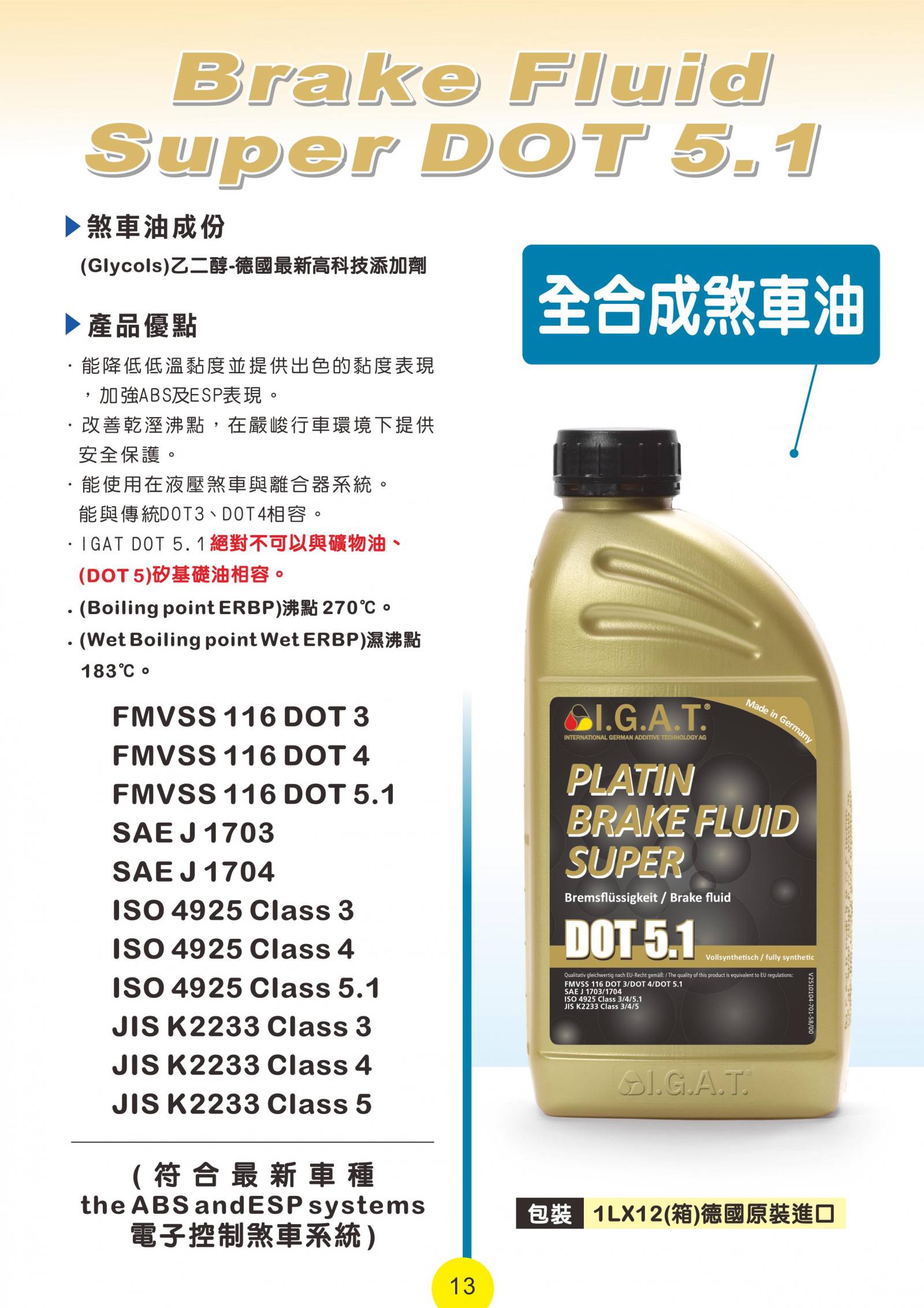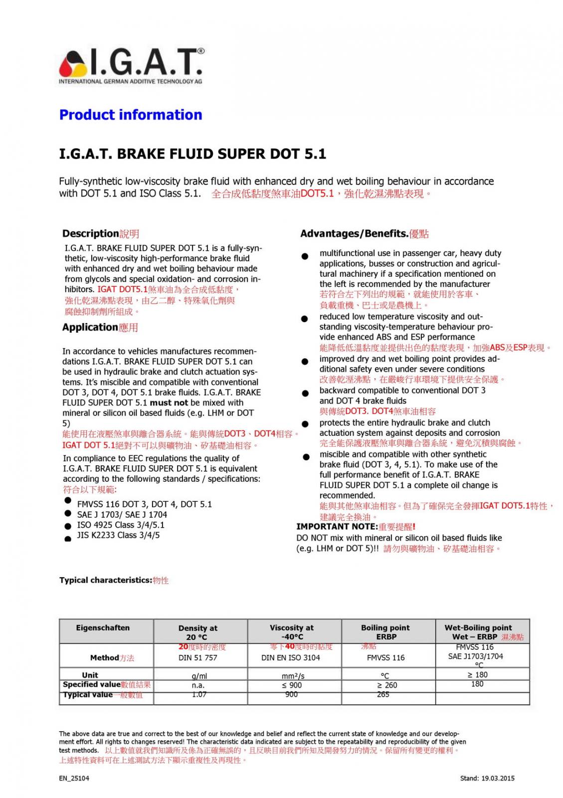 強化乾濕沸點表現全合成低黏度煞車油DOT5.1,強化乾濕沸點表現。IGAT DOT5.1煞車油為全合成低黏度, 強化乾濕沸點表現,由乙二醇、特殊氧化劑與 腐蝕抑制劑所組成。 1-若符合左下列出的規範,就能使用於客車、負載重機、巴士或是農機上。 2-能降低低溫黏度並提供出色的黏度表現,加強ABS及ESP表現。 3-改善乾溼沸點,在嚴峻行車環境下提供安全保護。 4-與傳統DOT3. DOT4煞車油相容. 5-完全能保護液壓煞車與離合器系統,避免沉積與腐蝕。 6-能與其他煞車油相容。但為了確保完全發揮IGAT DOT5.1特性,建議完全換油。 重要提醒!-------請勿與礦物油、矽基礎油相容。(LHM or DOT 5)
