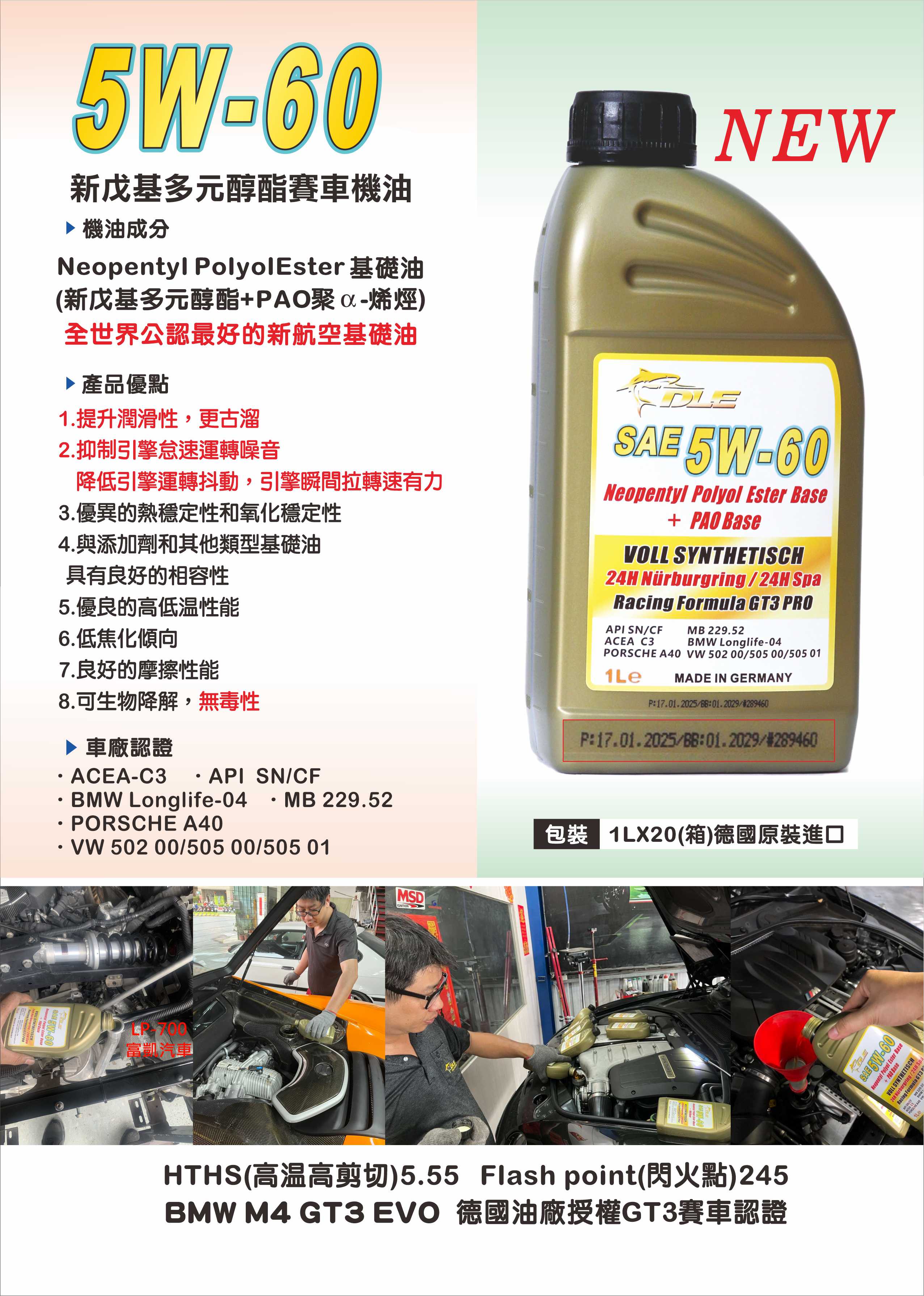 全合成PAO與(高品質多新戊基元醇酯基礎油)結合了非凡的添加劑 技術 >> 因此具有極高的抗氧化能力。 即使在極端低溫條件下,仍具有優異的低溫啟動能 力 。 高剪切穩定性及適應不同情況的黏度 >> 因此有傑 出的黏溫特性,達到真正的四季皆可使用。 極佳化黏度等級 >> 即使在極高的油溫及/或極高 的應力下,仍具有穩定的潤滑油膜。 具有多數製造廠商所要求的柴油及汽油引擎的多功 能應用,因此為高合理化產品。 低硫酸鹽灰分含量。 低磷及低硫成分,可防止柴油顆粒過濾器及三元觸 媒轉換器造成損壞。 極適合用於渦輪增壓引擎。 可有效防止引擎內部生成樹脂、清漆及汽缸活塞環 卡住、活塞、閥門及渦輪增壓器的損壞。 可有效防止黑色油泥的產生。 可將蒸發耗損降至最低 >> 因此有低機油耗量。 可與傳統及合成品牌的機油混合及相容。但為了達 到DLE Polyol-Ester FULLY SYN 5W/60 24H GT3 PRO完整的性能效益,建議將舊有的機油完 全更換。