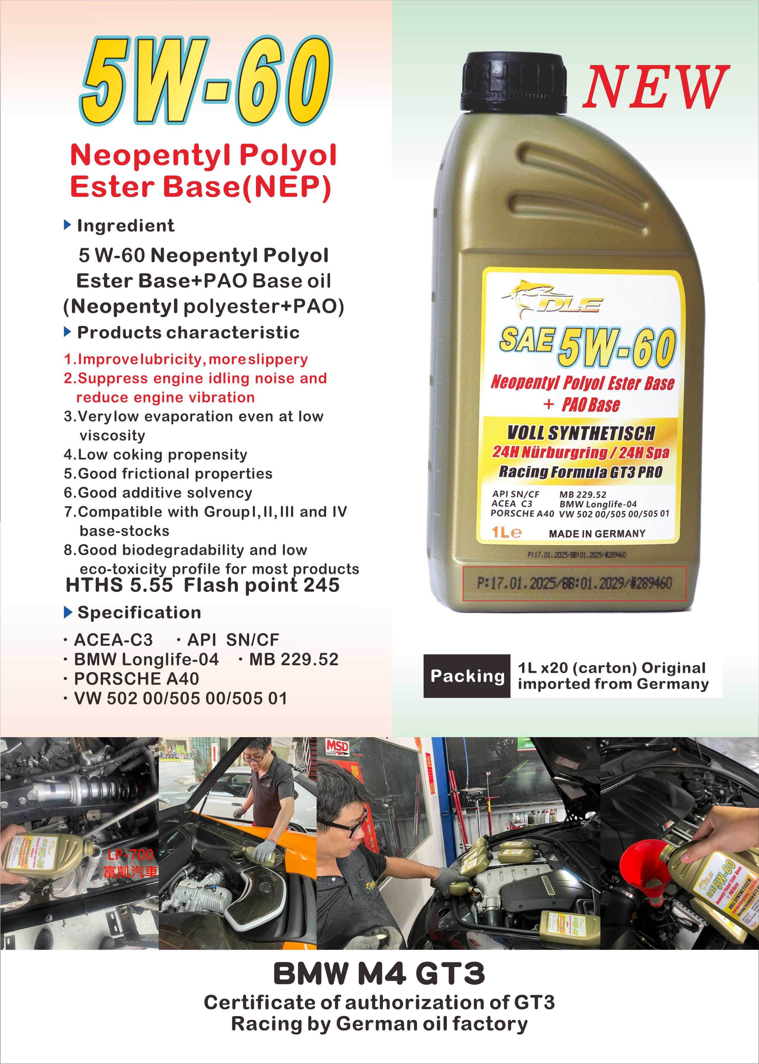 DLE NEOPOLYOL POLYOL-Ester FULLY SYN 5W/60 24H GT3 PRO 符合歐洲共同市場(EEC)的法規,亦即符合以 下的標準/規格: ACEA C3 -- API SN/CF -- BMW Longlife-04 -- MB 229.52 -- VW 502 00/505 00/505 01 -- BMW M4 GT3 BMW M6 GT3&Porsche 911 GT3 R