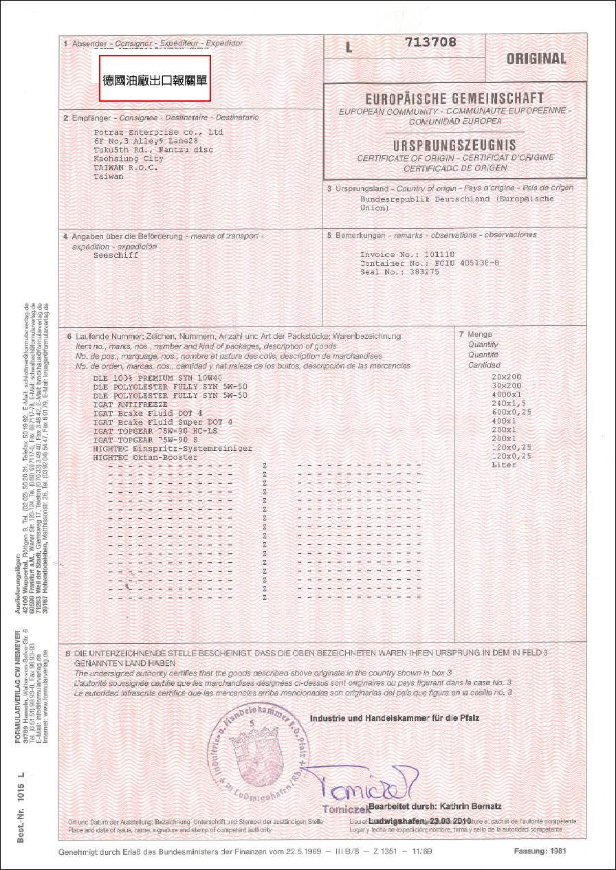 4-德國出口報關資料,很少能拿得到.這才是能證明原產地.