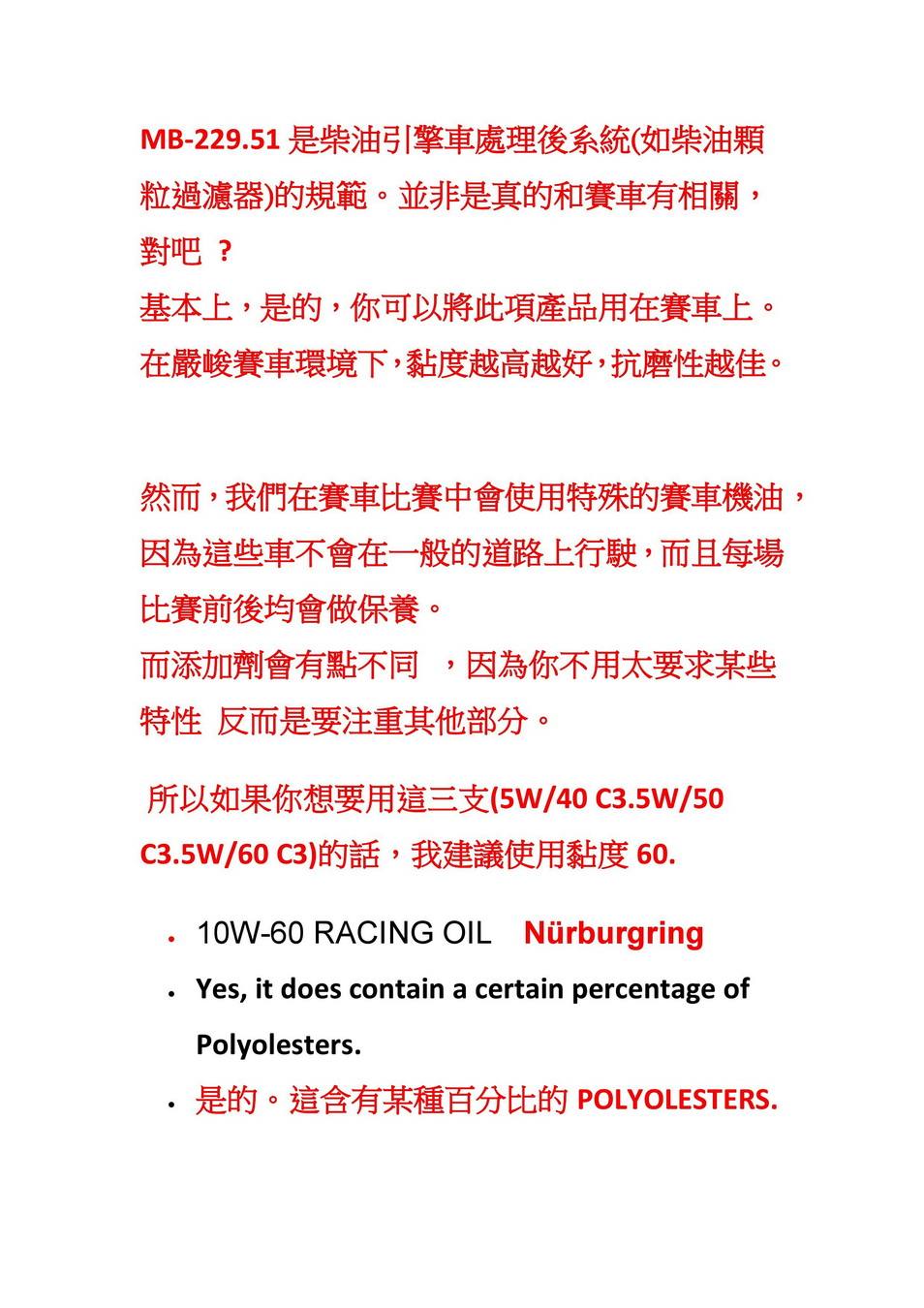 廣告詞都說我們家是真正賽車機油,那是誤導.真正賽車機油不適用在我們一般街車上,我們有問過德國油廠,他們正確回覆是賽車機油添加劑有點不一樣.一般街車換機油里程比較長,就是怕機油久了會產生酸性物質,腐蝕引擎內部機件與墊片.賽車機油是盡量榨出最大引擎動力與持續性,因為每場比賽前後都要換機油.比賽幾場引擎就要拆下來整理與研發更新賽車機油.