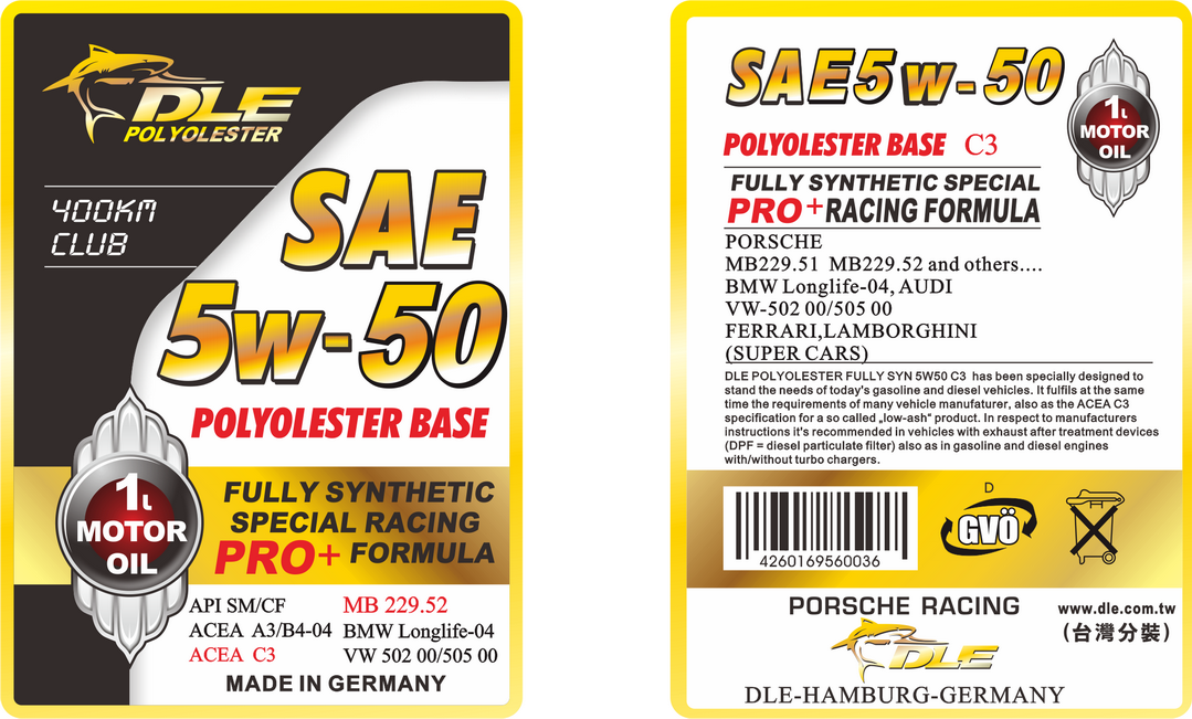 世界首創-努力向德國油廠爭取MB-229.52產品升級,從拒絕到最近下訂單願意替DLE做出高黏度MB-229.52機油.已經向德國油廠交涉好幾個月,終於願意製造給我們特殊的規範5W-60 C3 MB-229.52與5W-50 C3 MB-229.52這兩種產品先生產.另全世界的油廠傻眼,整麼可能有MB-229.52高黏度多元醇酯機油.真的是世界首創展現德國油廠研發實力,來自賽道比賽研發實力.