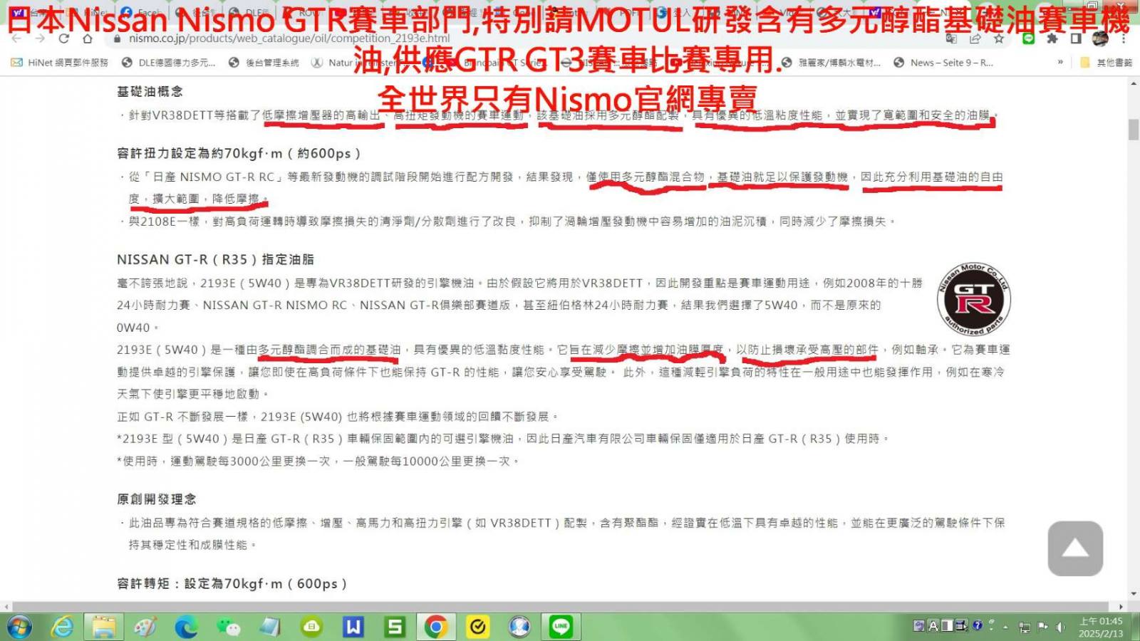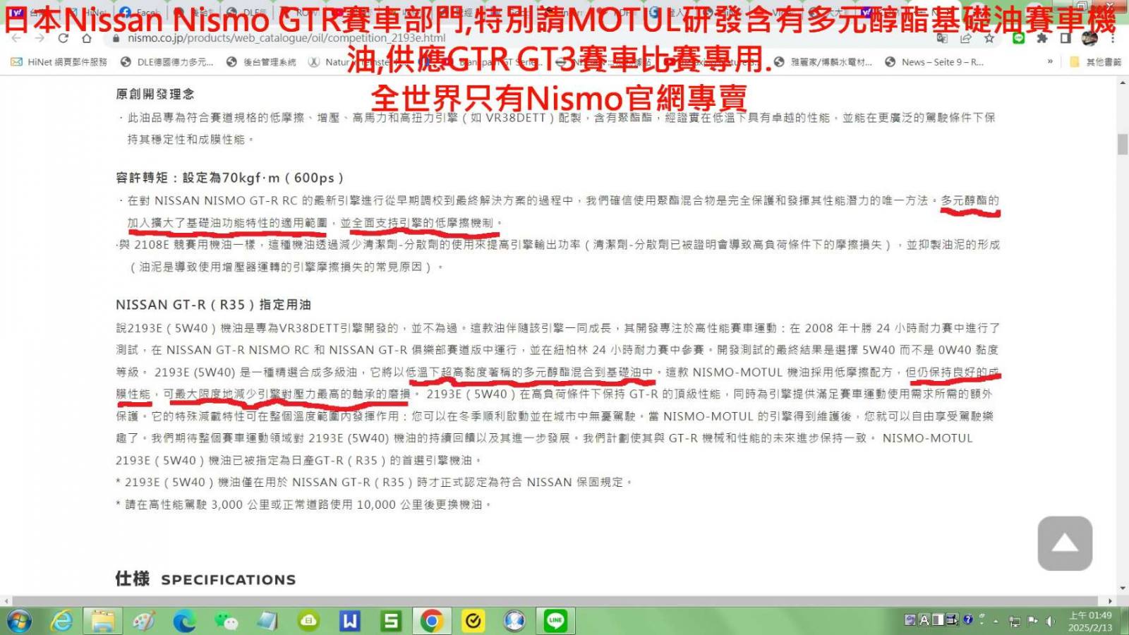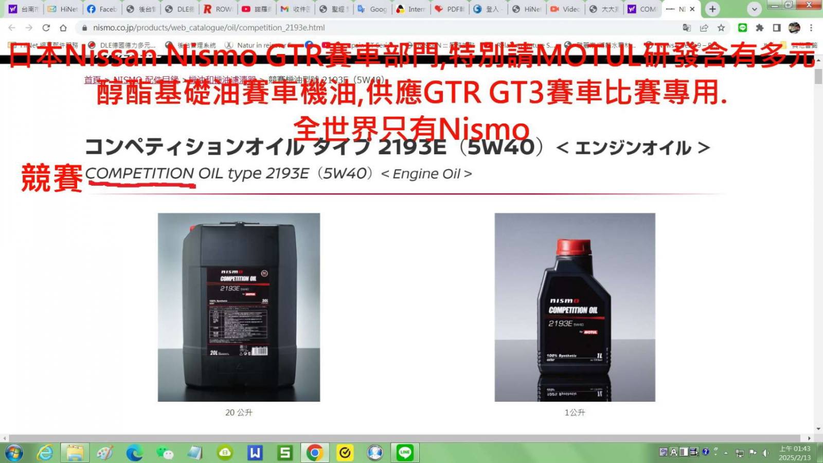 Competition oil type 2193E (5W40)此款油品是NISSAN NISMO和Motul合作開發專為賽車使用的機油。(競賽機油-含有多元醇酯基礎油)
