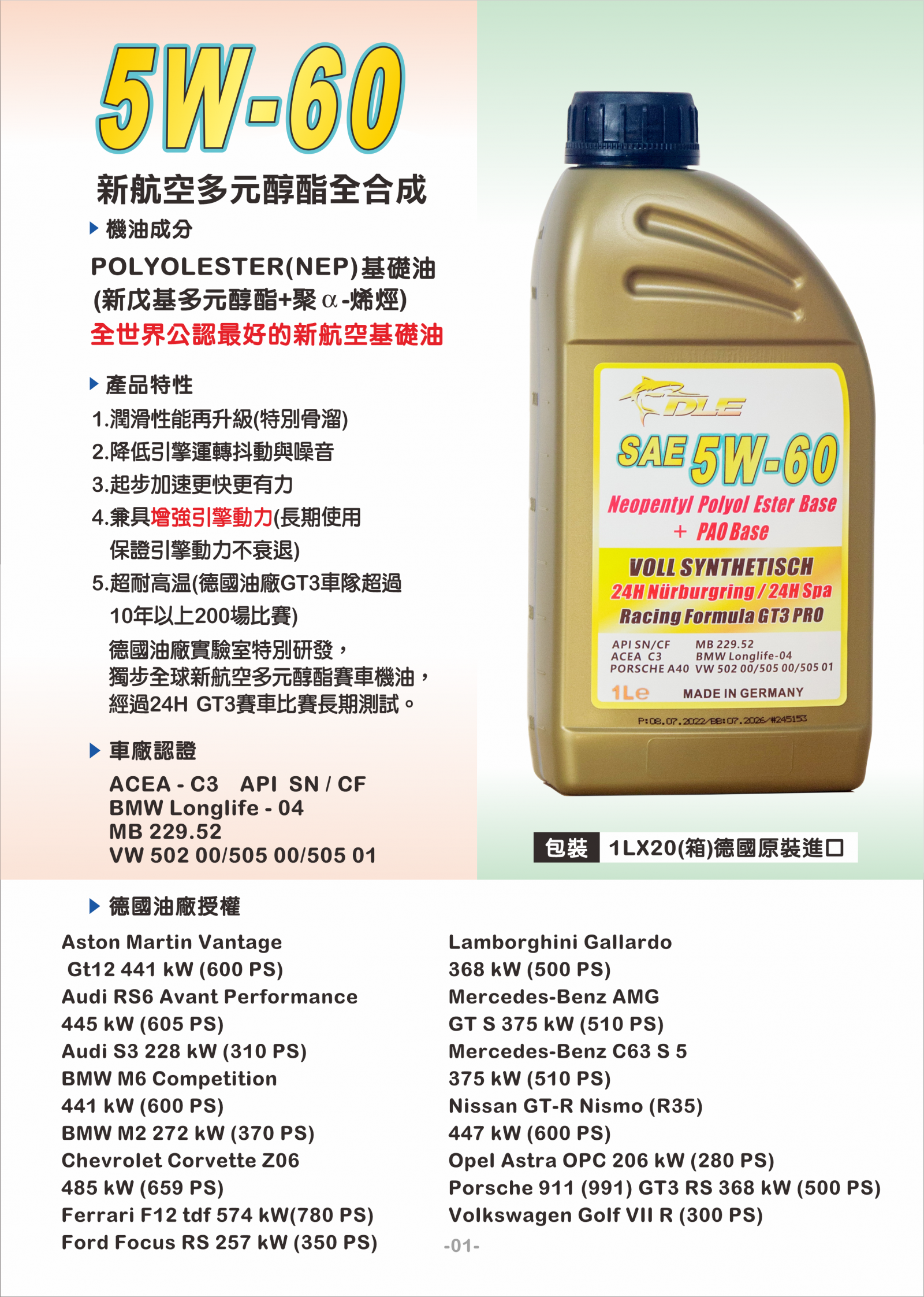 第一代 DLE 5W-60 Neopentyl Polyol Ester Base + PAO Base (庫存售完為止)