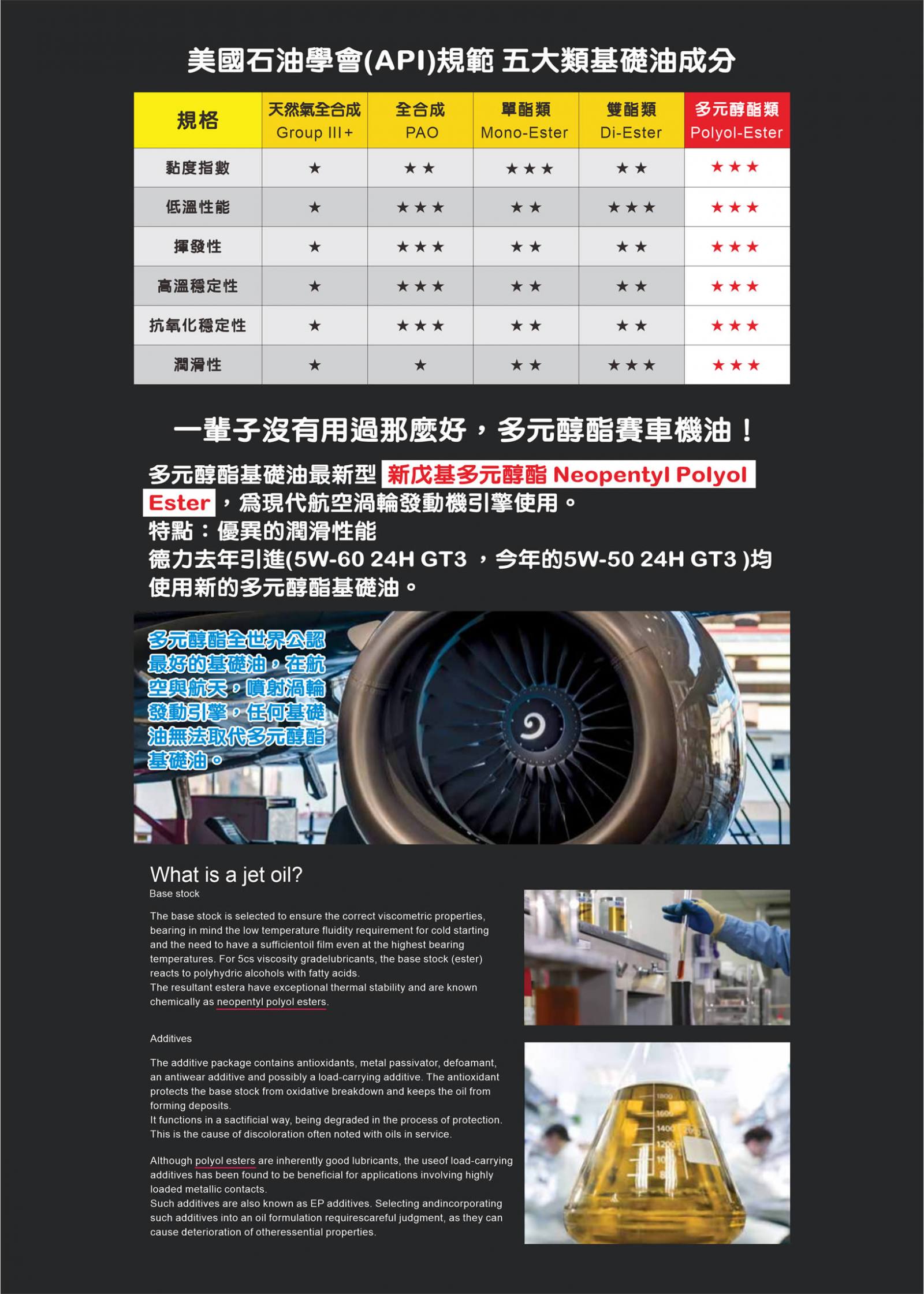 新戊基航空多元醇酯賽車機油5W-60 24H GT3 PRO 新戊基航空多元醇酯賽車機油 正式推出世界唯一DLE 5W-60 24H GT3 PRO,德國油廠正式授權GT3賽車認證.可以用在GT3賽車比賽.保證引擎動力提升明確(1-潤滑度要夠,2-又要耐高溫,3-還兼備增強引擎動力).