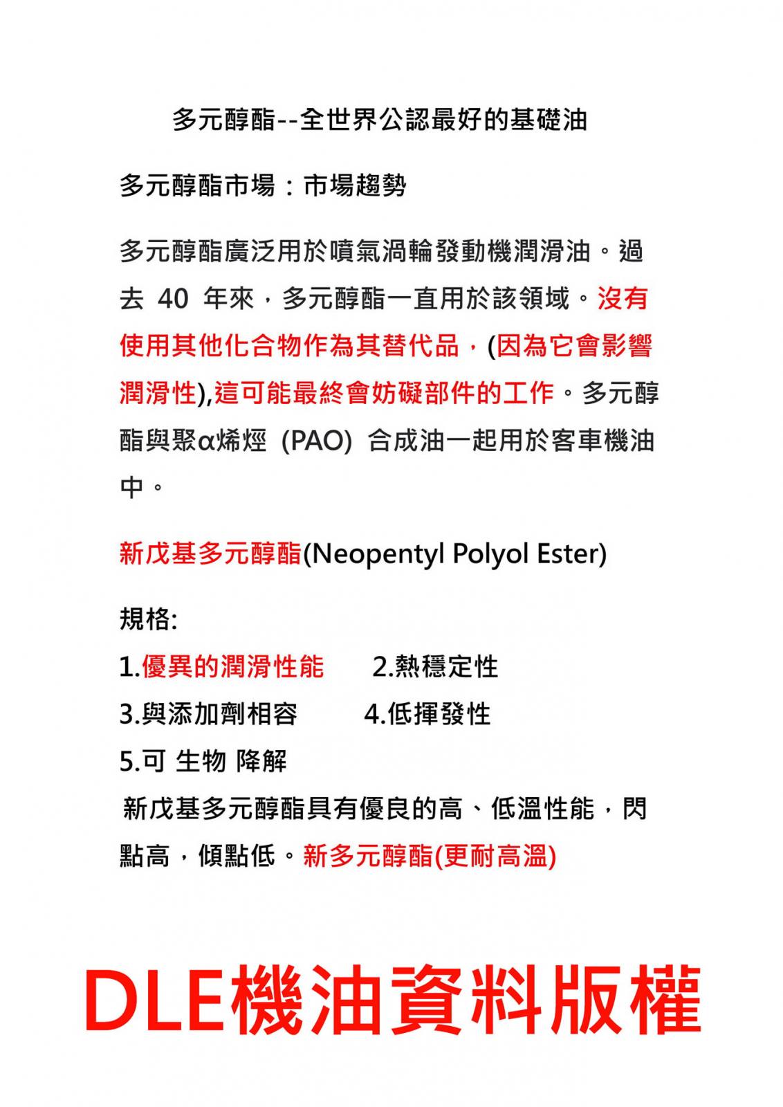 ‧新戊基航空多元酯 Polyol Esters > 機油 > 第一代 DLE 5W-60 Neopentyl Polyol Ester Base + PAO Base (庫存售完為止)