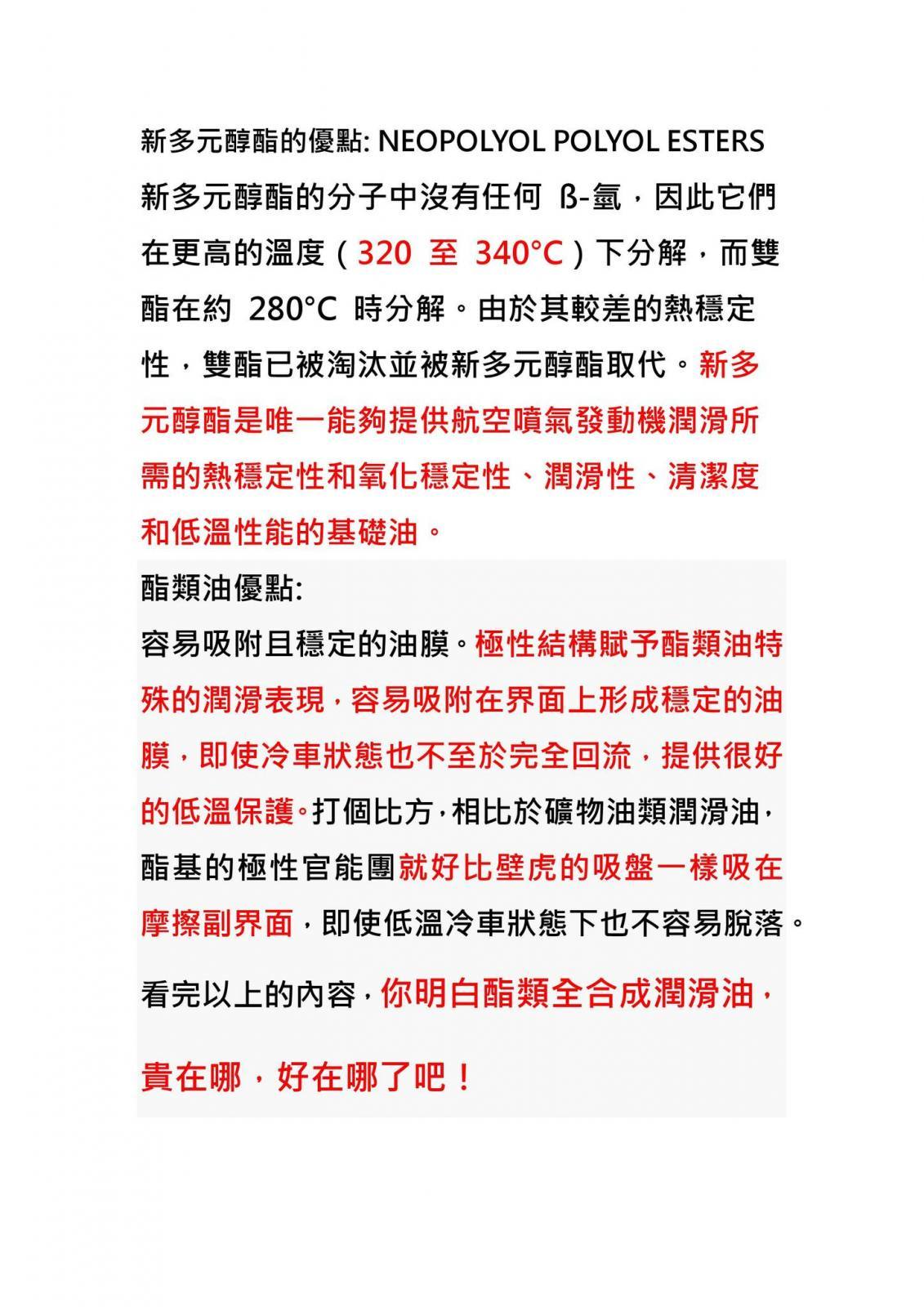 關於酯類油的特性 一再強調這對消費者來說非常重要,只有酯類油做得到。 在一般的情況下,酯類油會在兩接觸面形成一層連續的油膜。 這層油膜有液態潤滑的作用,防止金屬與金屬間直接接觸,減少摩擦。 潤滑油能否提供液態潤滑,取決於能否在兩個金屬表面上形成不破裂的油膜。 當這層油膜在高強度的情況下破裂,便會造成阻力和摩擦。 能在其他潤滑油失效的條件下仍然保持優越的潤滑作用,這便是酯類油在臨界潤滑情況下的優勢。 酯類油優點多,其極性強、耐高溫、蒸發損失低、潤滑性好,且有優異的熱氧化安定性和低溫流動性。 熱安定性能好,單純從熱分解溫度來看,雙酯類油一般在280度左右,醇酯類油超過300度。 這跟其分子結構有關,以新戊基多元醇酯化而來的全阻化酯,分解溫度更高。 容易吸附且穩定的油膜,極性結構賦予酯類油特殊的潤滑表現,容易吸附在界面上形成穩定的油膜。 即使冷車狀態也不至於完全回流,提供很好的低溫保護。 酯類分子中所含氧元素使它具有正電極,含氫元素使它具有負電極。 由於電極作用,可以使酯類分子吸附在金屬表面,形成一層稱為黏附分子油膜的油層。 正是這層黏附分子油膜使酯類油從其它因黏性而形成油膜的油中脫穎而出。當引擎啟動的時候,潤滑油性能的好壞就更容易辨別了。 那些依靠黏度而形成油膜的潤滑油,在引擎停止工作的時候會從金屬表面流走。 當引擎再次啟動時,兩金屬表面的油膜已經消失。 相反,那些不是依靠黏度來實現液態潤滑的黏附分子油膜即使是在引擎停止工作後,它也能夠存在於在兩金屬表面之間。 也就是說以酯類作為基礎油的潤滑油,即使引擎停下來,也可以對引擎有著不間斷的保護。 在城市中駕車,經常會走走停停。 此時,車的引擎承受的負荷比賽車時還大。 要保護好它,挑選合適的機油是十分關鍵的。 潤滑油是由基礎油和添加劑組成的,其中基礎油約佔了70-95%以上的比例。 台灣的氣候炎熱,不適合使用稀薄的機油。 選擇品質好的機油很重要。 好的油就是有好的黏度。 關於這點,有請教德國油廠關於機油品質和黏度是否有關。 他們回覆說並無直接關係。 機油的品質是基礎油和添加劑的質量有關。 黏度大小並不會直接影響品質,是看基礎油的品質和添加劑(在於多元醇酯基礎油研發技術、改善高黏度潤滑性、優於極稀薄黏度機油)。 選購真正全合成機油,可以增強引擎動力提升。 |
