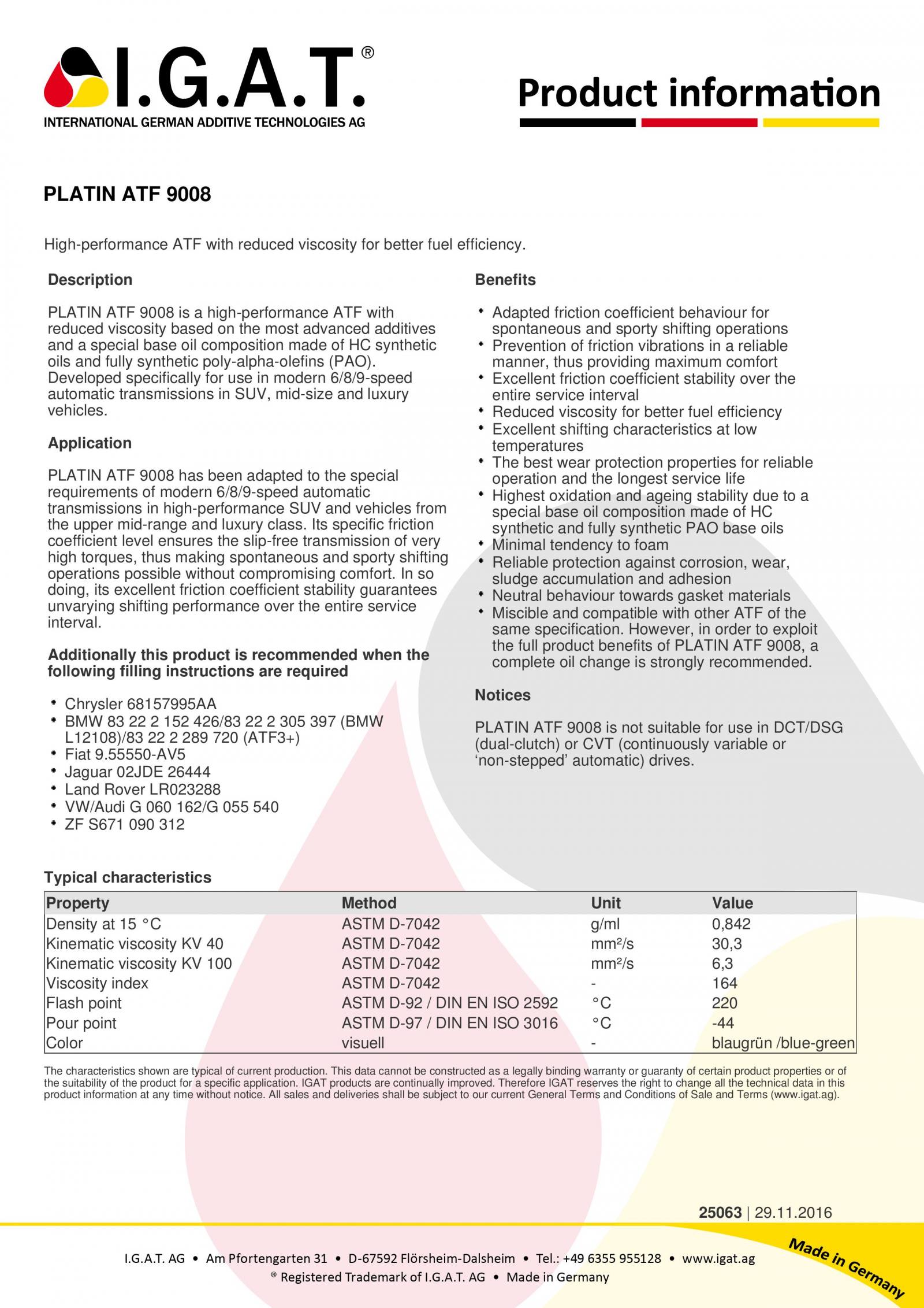 特別針對現今 SUV,中距離及豪華車輛.PLATIN ATF 9008 為使用最新的添加劑,以及碳 氫合成及全合成 PAO ( 聚 -α- 烯烴 ) 混合的特殊基 礎油調製而成的低黏度高效能自動排檔油 (ATF)。