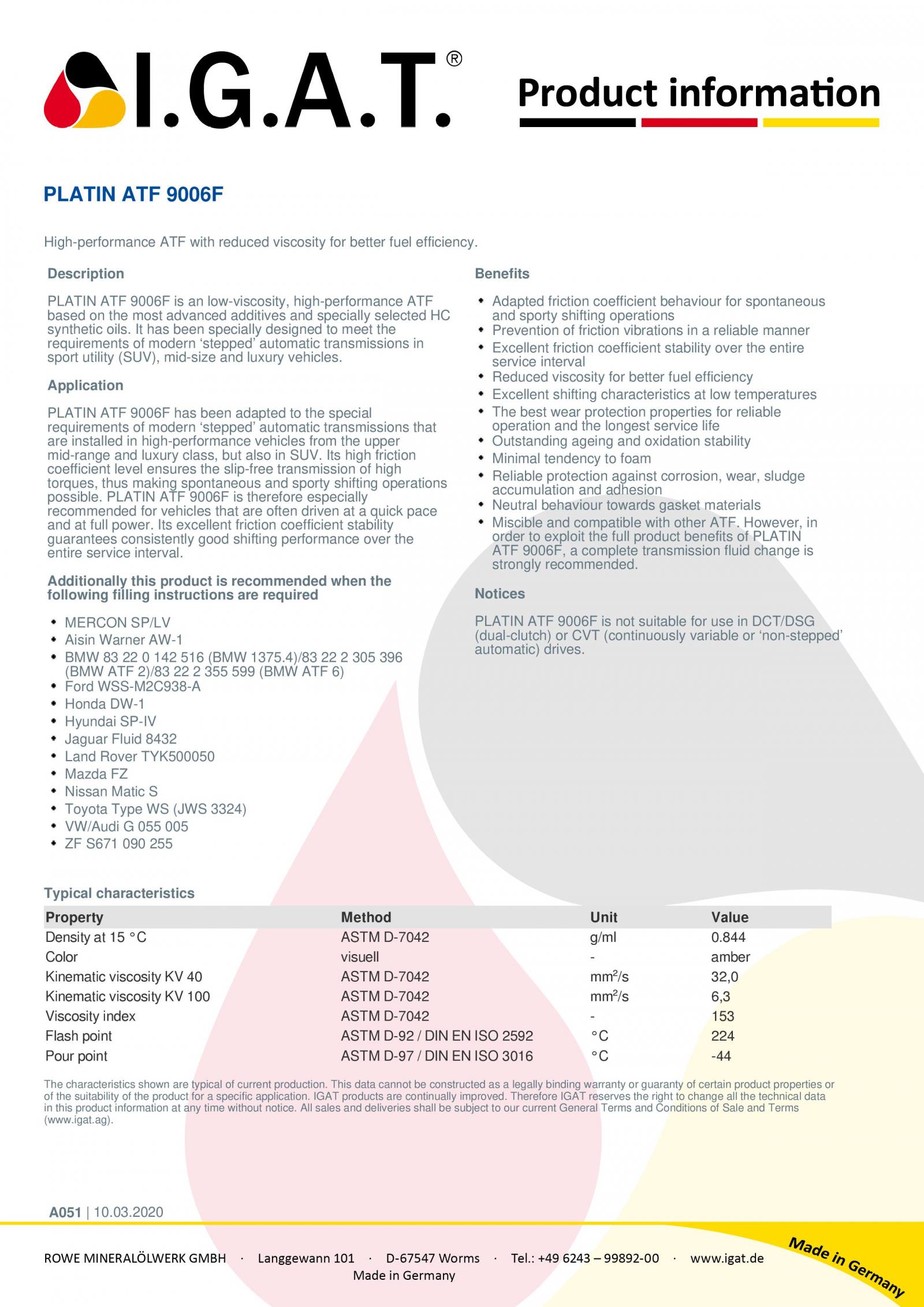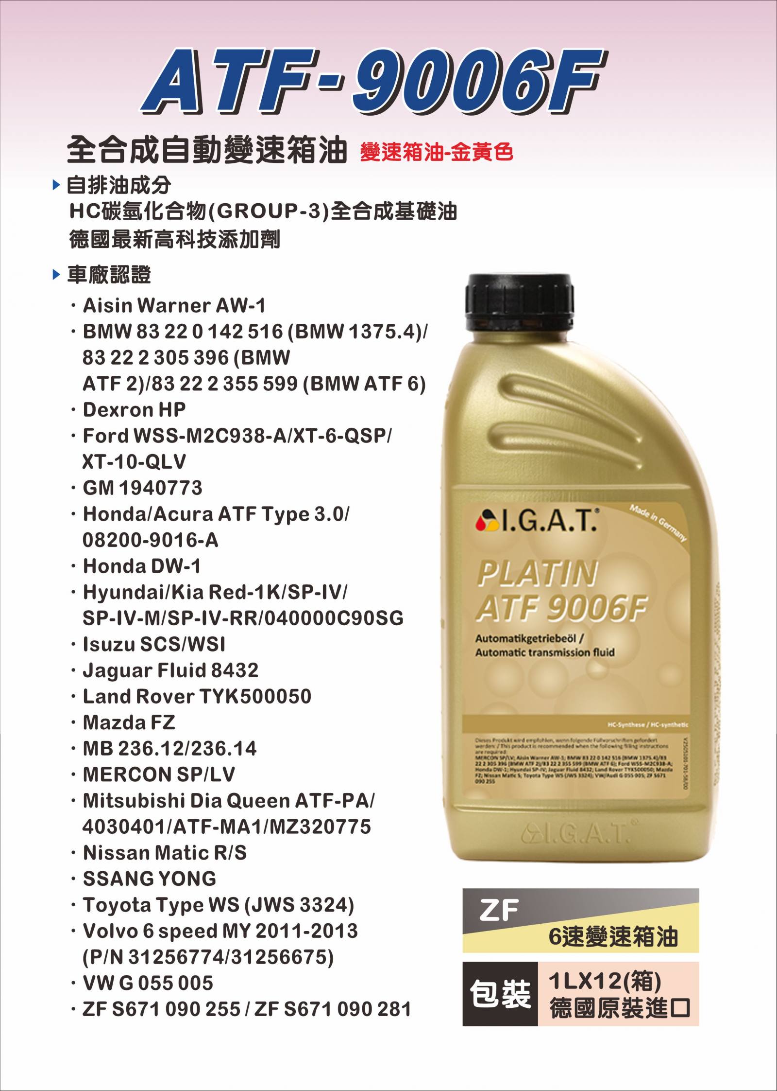 ‧新戊基航空多元酯 Polyol Esters > 機油 > IGAT PLATIN ATF 9006F全合成自排油