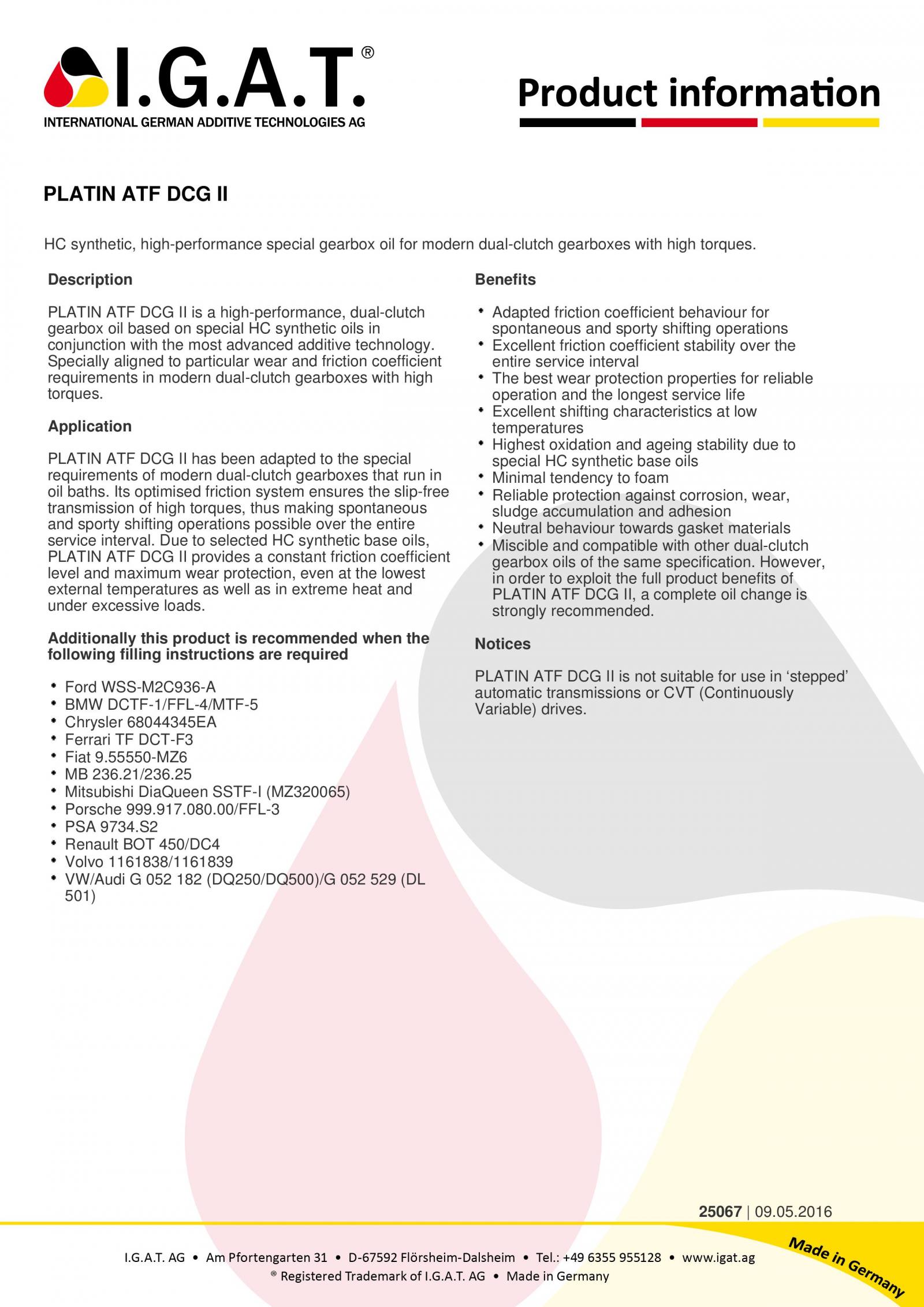 係針對當今具有高扭力雙離合器變速箱的特定磨損及摩擦需求而設計,此為高效能,碳氫合成油的 特殊變速箱油。 PLATIN ATF DCG II 為高效能的雙離合器變速箱油,係以特殊的碳氫合成油為基礎,結合先進的添加劑調配而成。