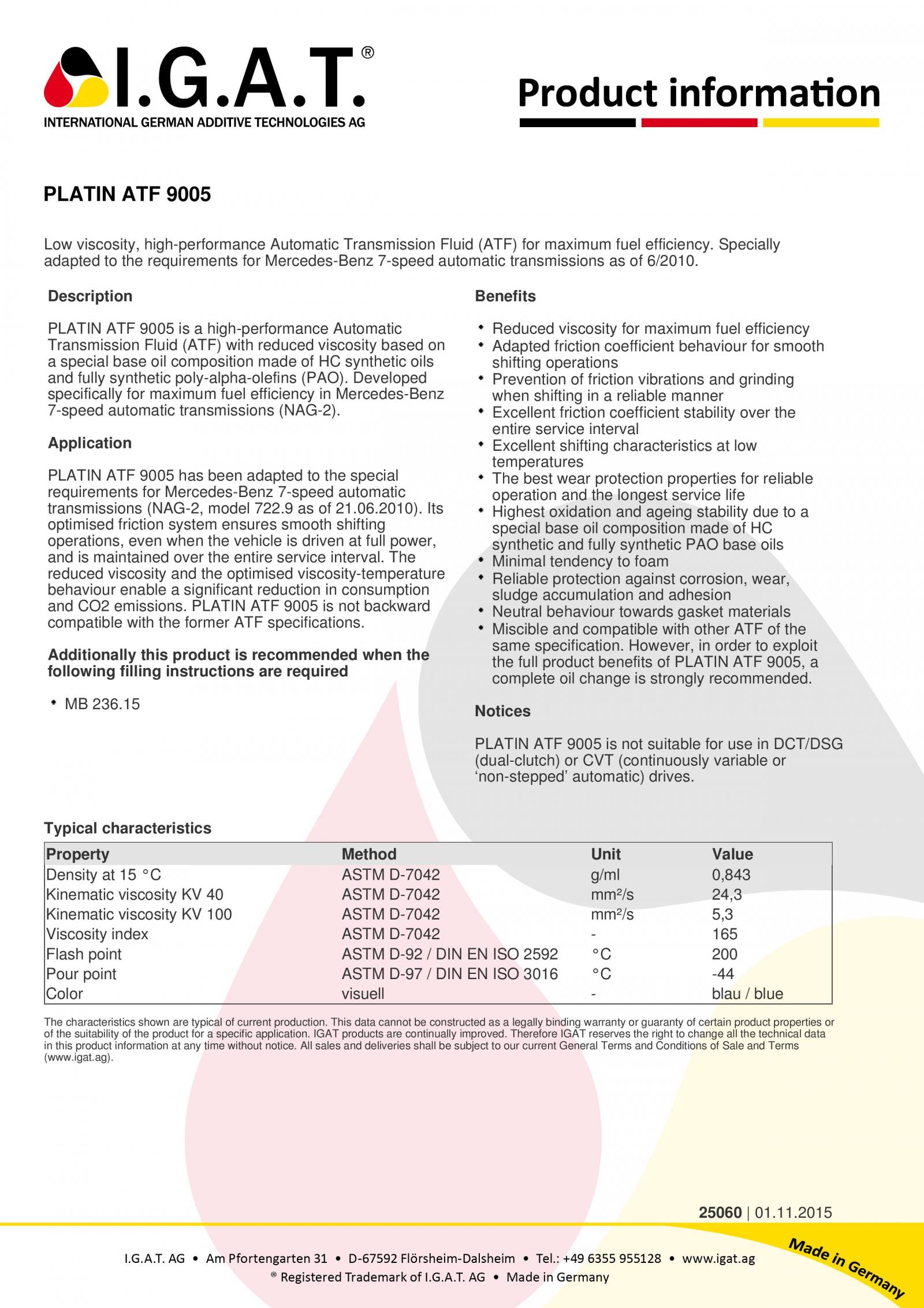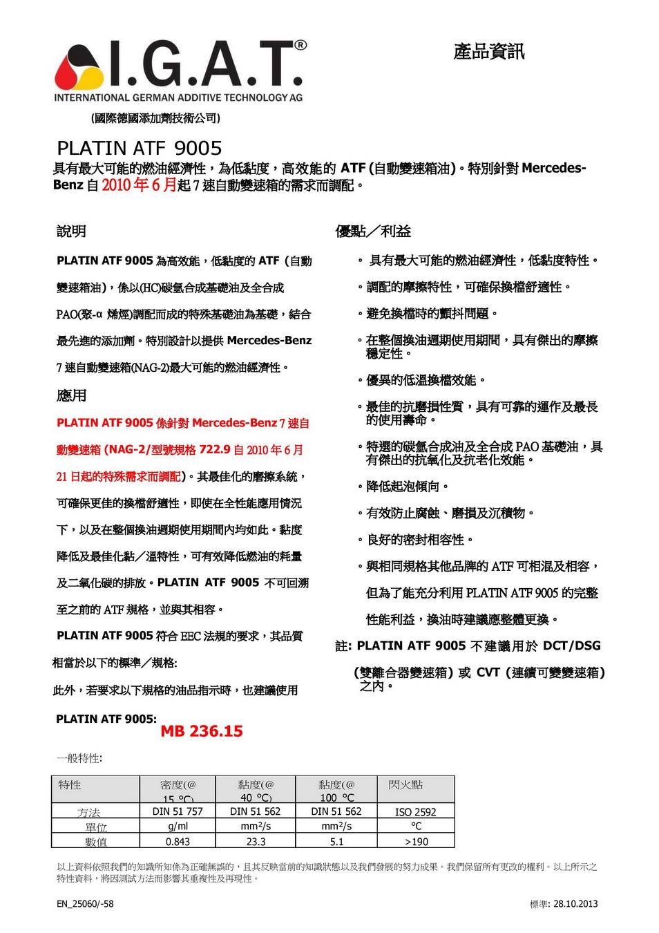 IGAT PLATIN ATF 9005 BENZ 最新7G-TRONIC七速自排全合成自排油PLATIN ATF 9005 為高效能,低黏度的ATF (自動變速箱油),係以碳氫合成基礎油及全合成PAO(聚-α烯烴)調配而成的特殊基礎油為基礎,結合最先進的添加劑。特別設計以提供Mercedes-Benz 7速自動變速箱(NAG-2)最大可能的燃油經濟性。
