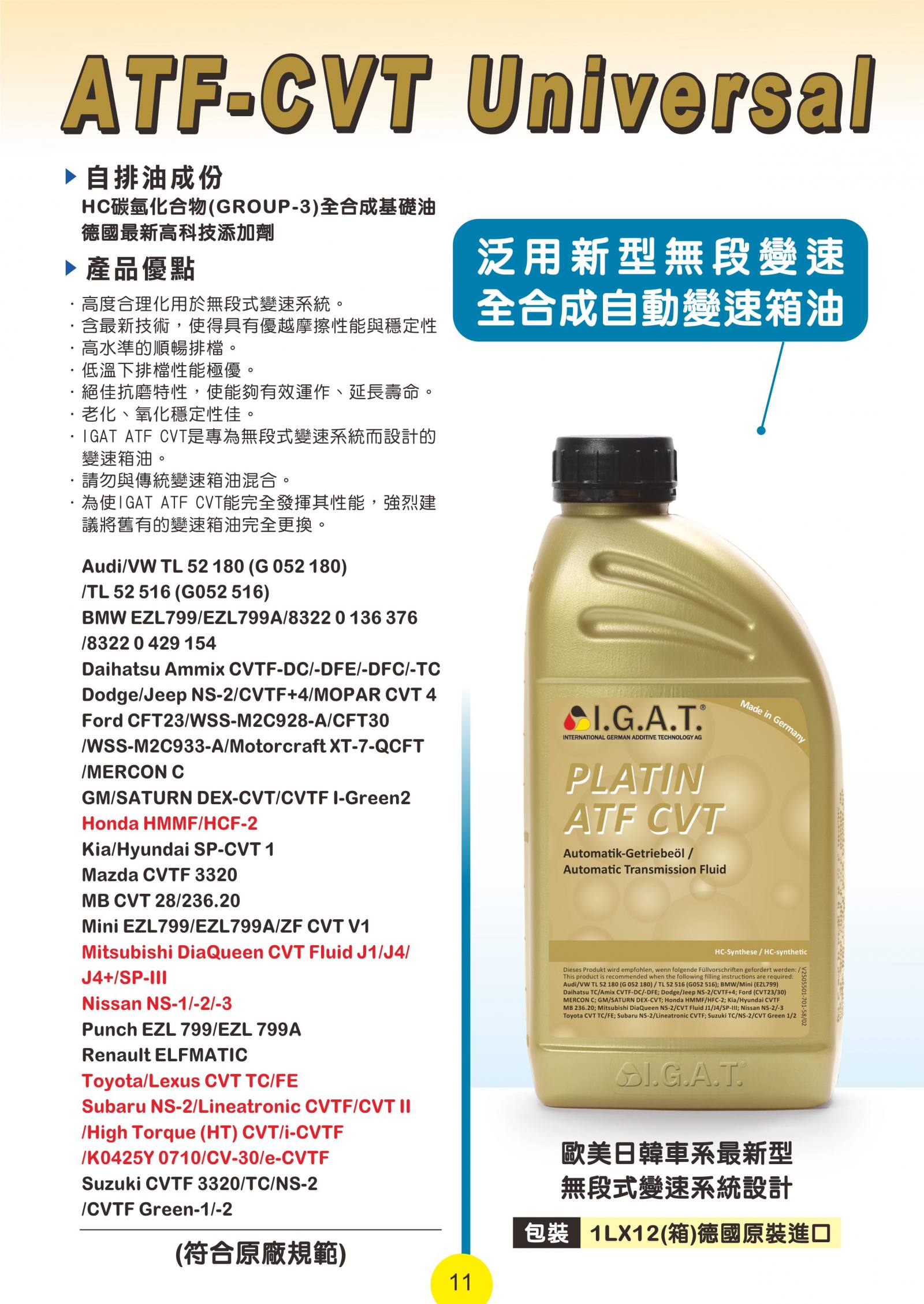 IGAT ATF CVT可用於多數之無段式變速系統。展現優越金屬摩擦性能及高扭力。請遵照車廠之填裝與換油期間指示