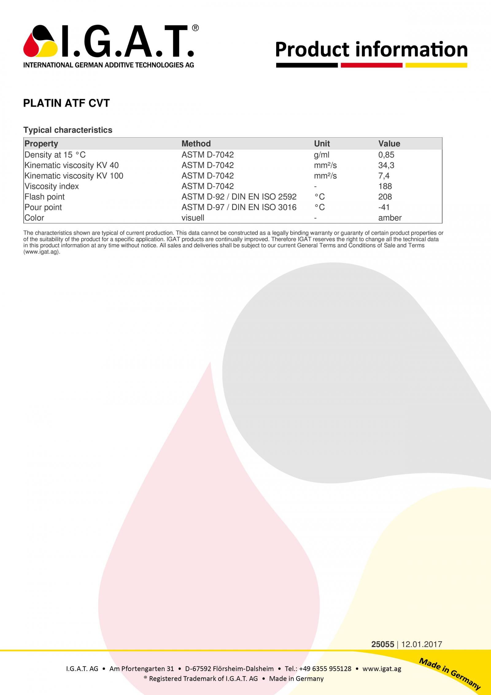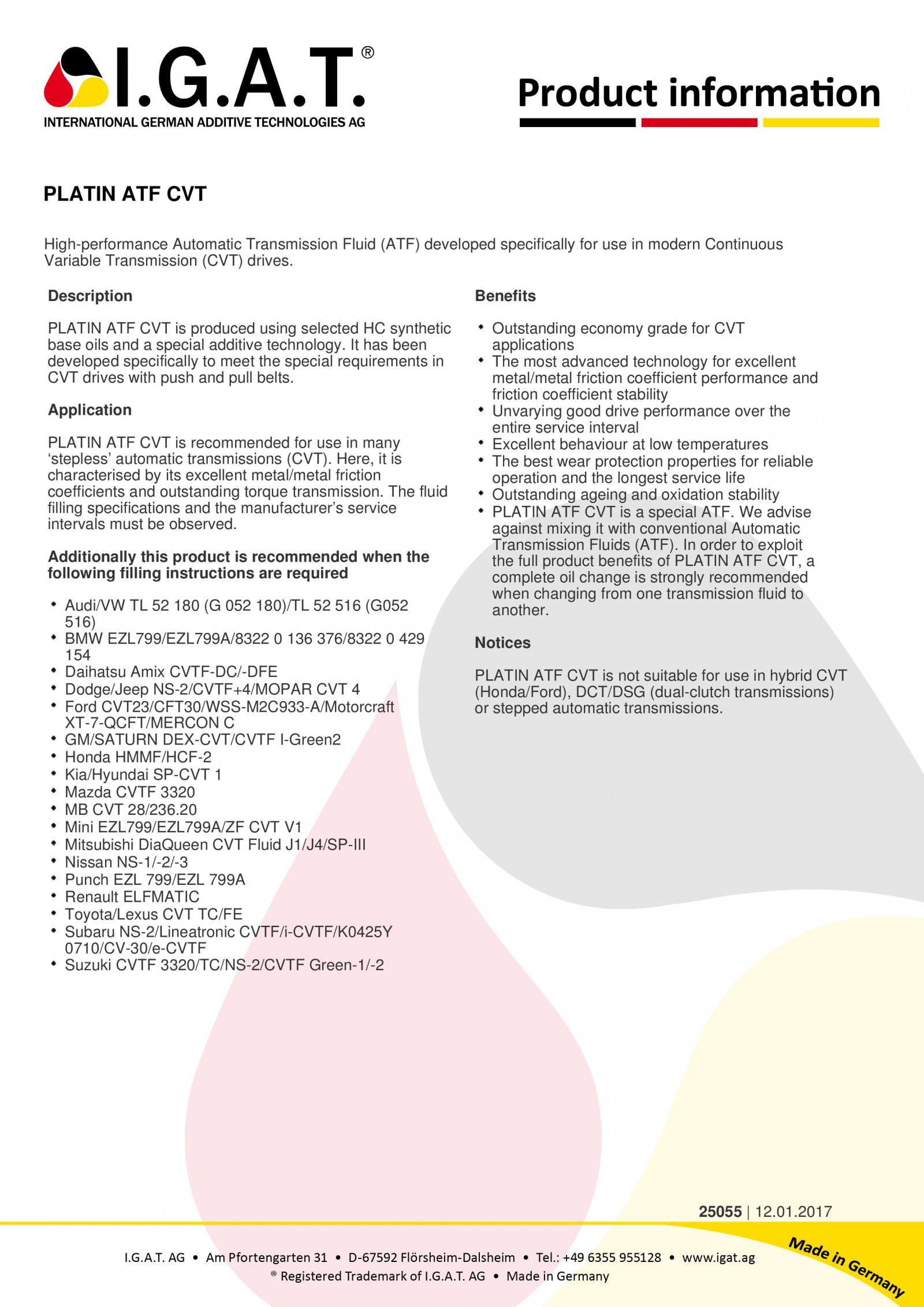IGAT ATF CVT是以精心挑選的精緻(HC)合成基礎油與特殊添加劑而製成。IGAT ATF CVT一直專為符合無段式變速系統之獨特要求而設計。