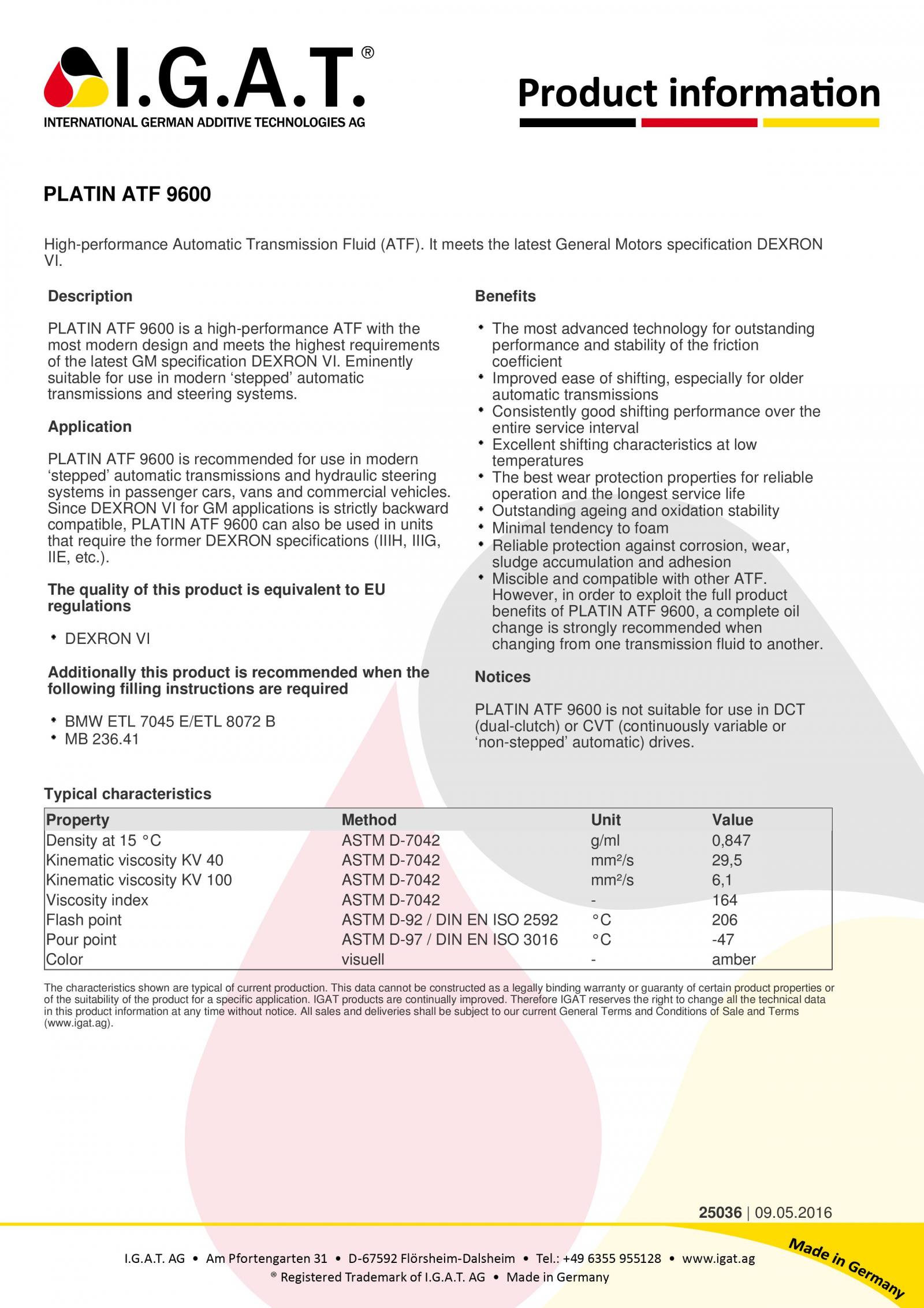 IGAT ATF-9600[DEXRON -VI] (6號-自排油) NEW增加新的認證 MB-236.41 Gear Oil for(MB- ML Class-Hybrid) (type: 164.195 transmission: 722.550) (美規6速變速箱-美國車與BMW車有裝GM變速箱)