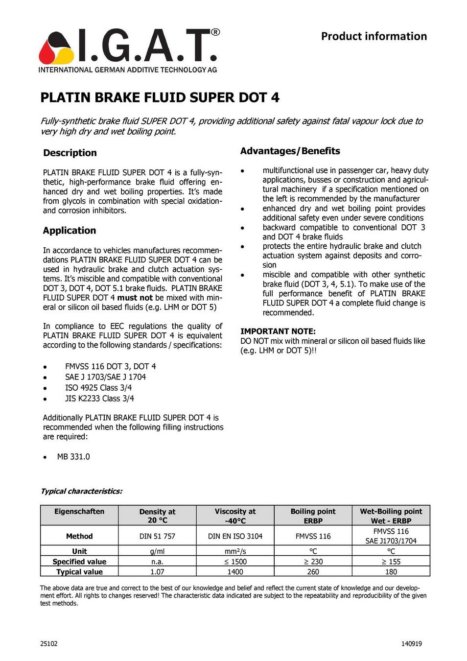 In compliance to EEC regulations the quality of PLATIN BRAKE FLUID SUPER DOT 4 is equivalent according to the following standards / specifications: