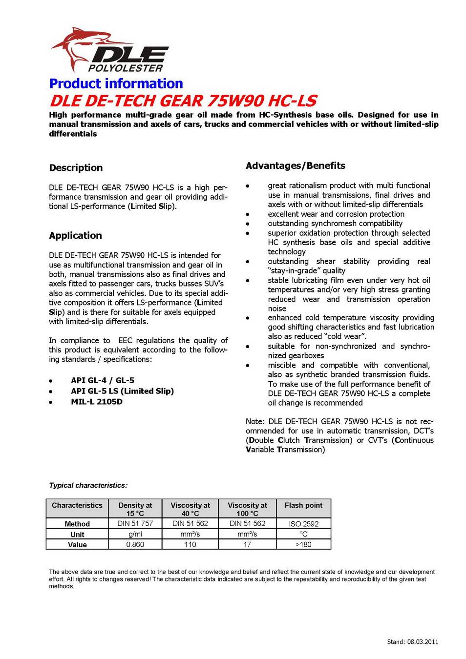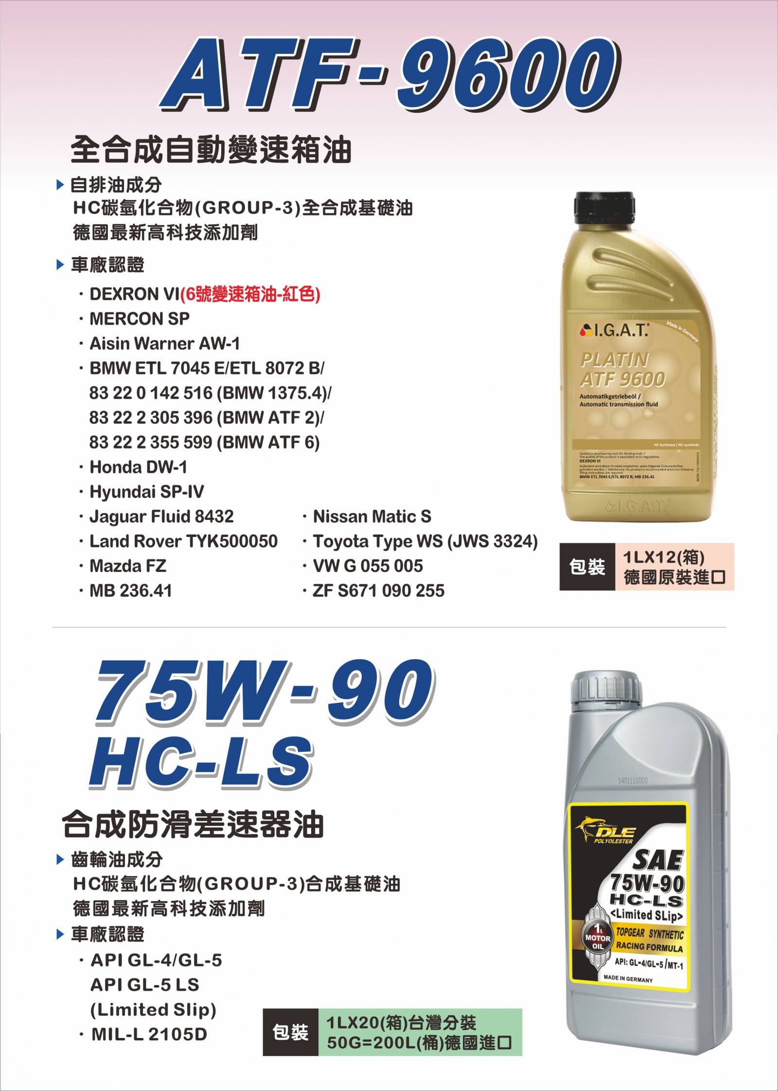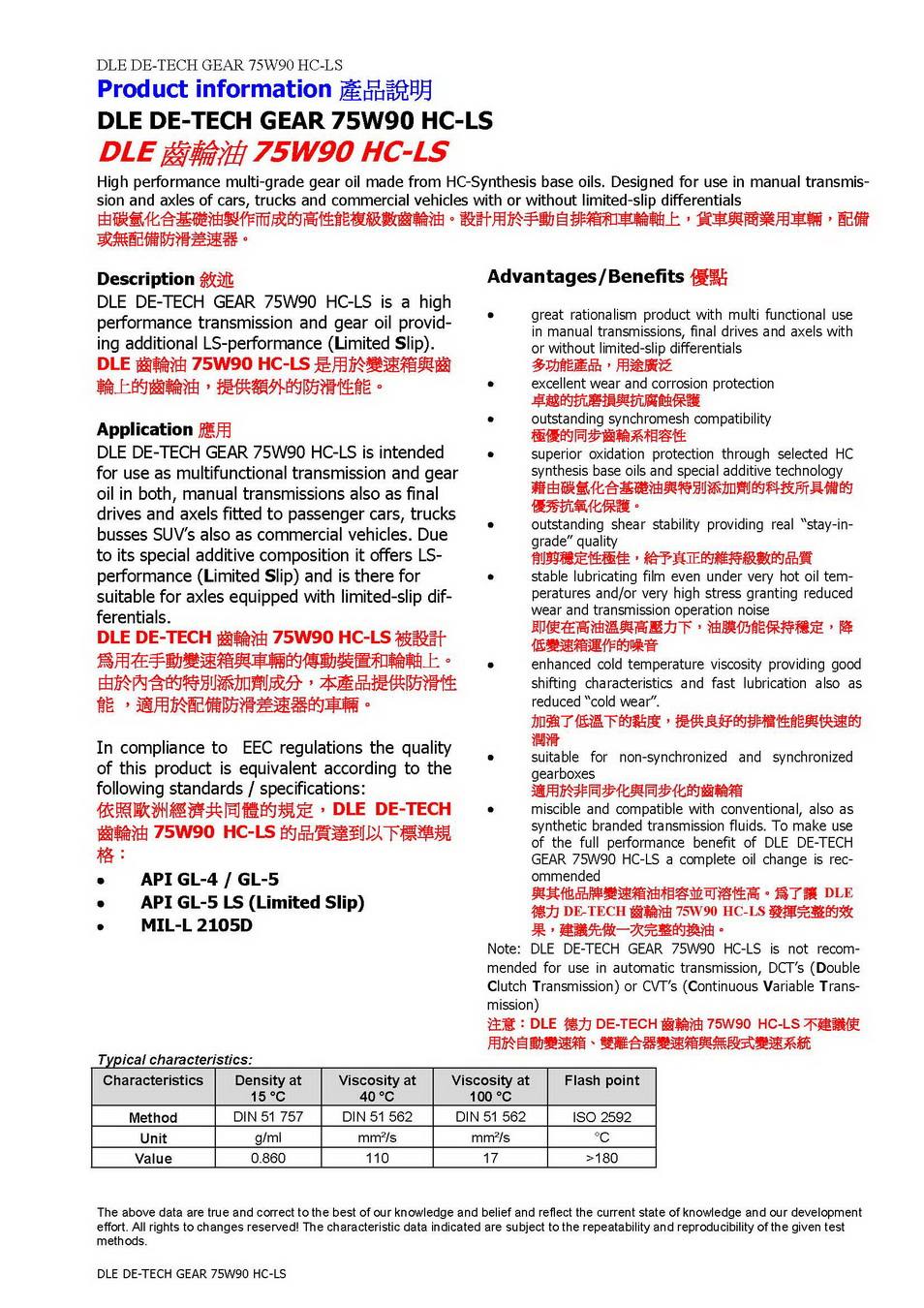 Gear Oil LSD SAE: 75W-90 HC-LS(synthetic)高科技頂級防滑差速器油新一代有防滑裝置差速器(4x4專用)開發,也可用在有(後差速器裝置與手排變速箱).減少過彎產生異音。高性能-多用途-低摩擦的HC合成技術。適用於有/無差速器鎖定系統的新一代手排變速箱。最佳的抗磨損保護,保證在低溫下輕鬆切換。高科技技術:省油與低磨損。