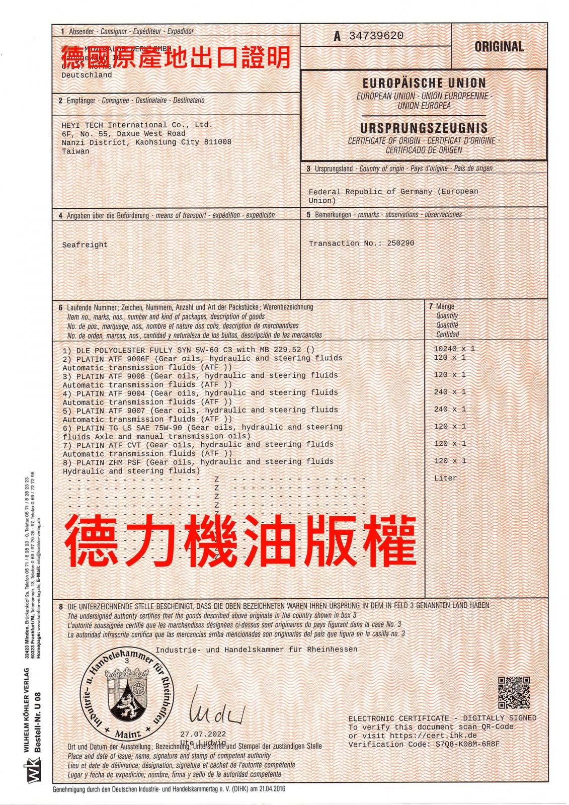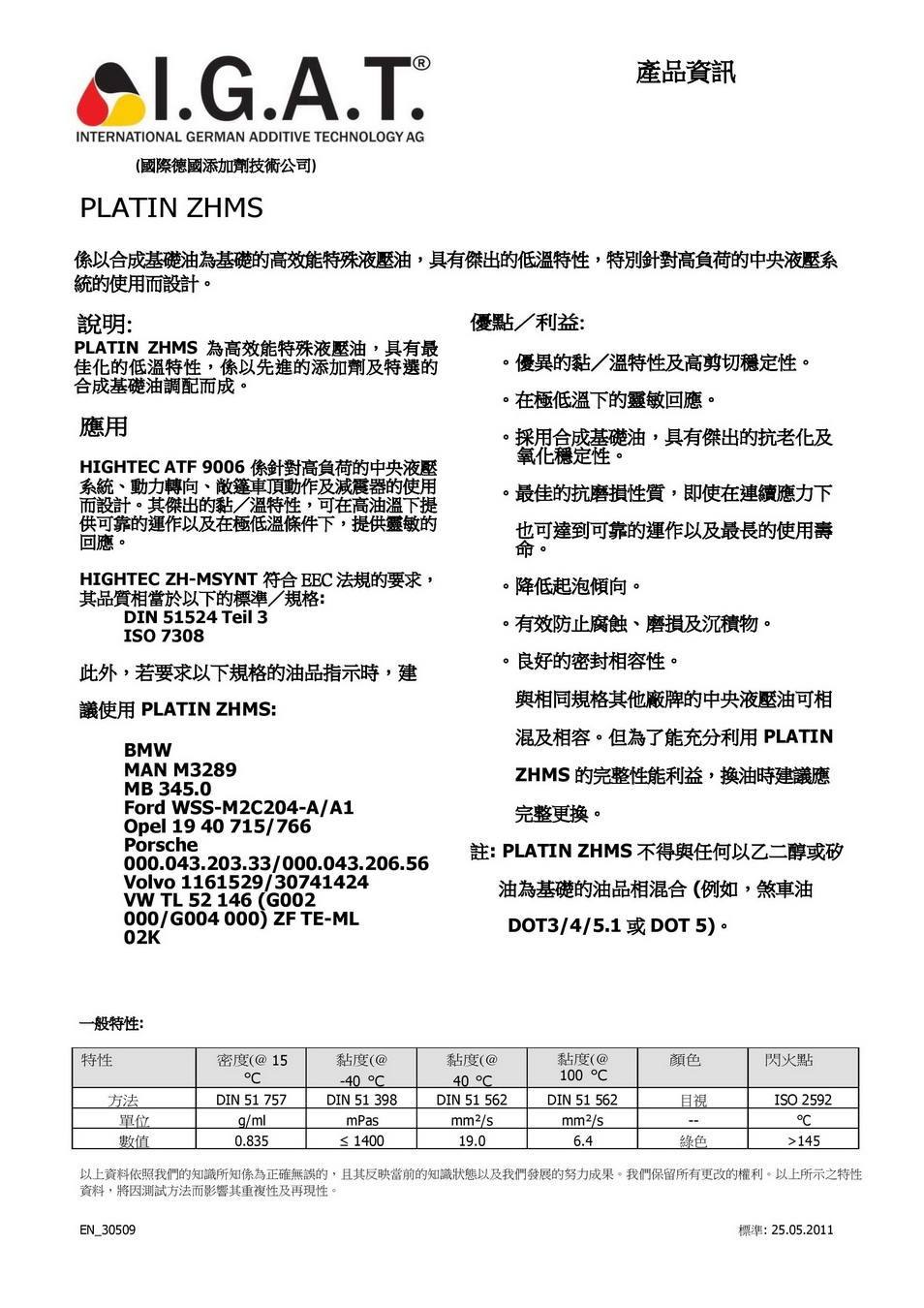 註: PLATIN ZHMS 不得與任何以乙二醇或矽油為基礎的油品相混合 (例如,煞車油 DOT3/4/5.1 或 DOT 5)。