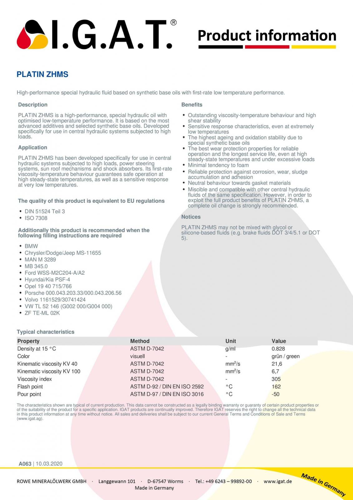 係以合成基礎油為基礎的高效能特殊液壓油,具有傑出的低溫特性,特別針對高負荷的中央液壓系統的使用而設計。 PLATIN ZHMS 為高效能特殊液壓油,具有最佳化的低溫特性,係以先進的添加劑及特選的合成基礎油調配而成。 HIGHTEC ZH-MSYNT係針對高負荷的中央液壓系統、動力轉向、敞篷車頂動作及減震器的使用而設計。其傑出的黏/溫特性,可在高油溫下提供可靠的運作以及在極低溫條件下,提供靈敏的回應。 HIGHTEC ZH-MSYNT 符合EEC法規的要求