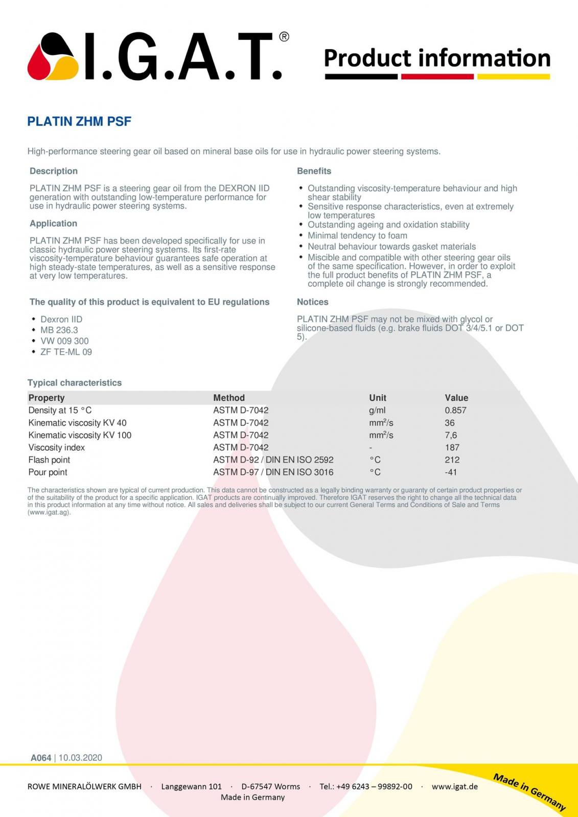 PLATIN ZHM PSF是一款來自DEXRON IID的轉向齒輪油。 具有出色的低溫性能,用於液壓動力轉向系統。 在液壓動力轉向系統中使用。PLATIN ZHM PSF是專門為傳統液壓動力轉向系統而開發的。經典的液壓動力轉向系統。其一流的 黏度-溫度特性保證了在高穩定溫度下的安全操作。高穩態溫度下的安全運行,以及在極低溫度下的敏感反應。 在非常低的溫度下的敏感反應。